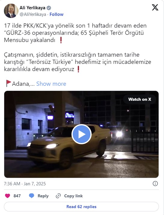 Yerlikaya, Adana, Antalya, Diyarbakır, Edirne, Eskişehir, Gaziantep, İstanbul, İzmir, Kars, Kocaeli, Malatya, Manisa, Muğla, Muş, Şanlıurfa, Şırnak ve Van'da, Cumhuriyet Başsavcılıkları ile Emniyet Genel Müdürlüğü TEM Daire Başkanlığı ve İstihbarat Başkanlığı koordinasyonunda, PKK/KCK'ya yönelik operasyonlar düzenlendiğini vurguladı.