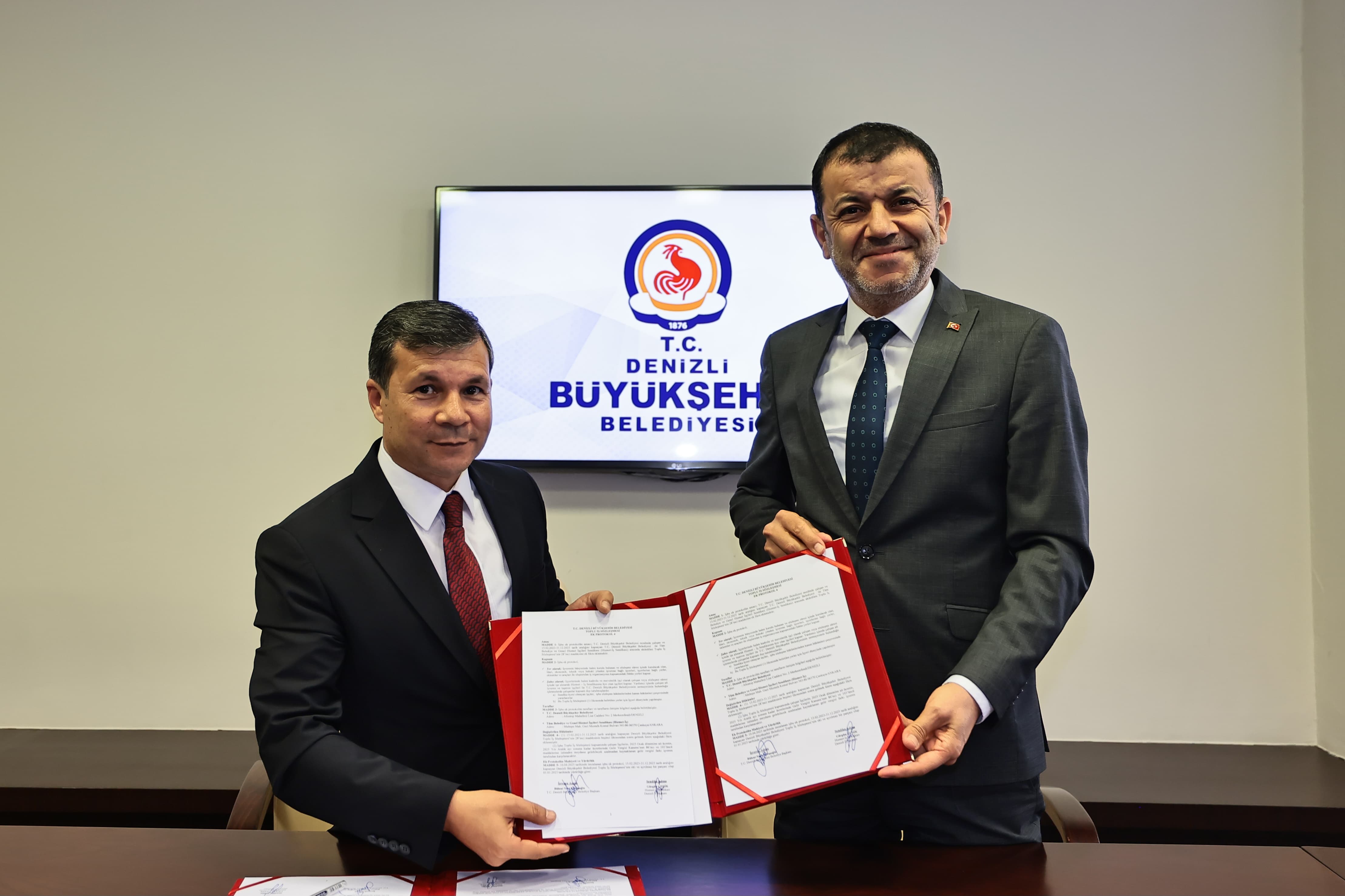 Hizmet-İş Sendikası Denizli Şube Başkanı Gürgün Gedik ise, Başkan Bülent Nuri Çavuşoğlu’na teşekkür ederek, Başkan Çavuşoğlu’nun emek ve emekçiden yana olduğunu vurgulayarak, “Emekten ve emekçiden yana bir tavır sergilemiştir. Bizim gönlümüzde yeri her zaman ayrıdır. Bizim bir büyüğümüz ve ağabeyimizdir. İşçi arkadaşlarımıza sunduğu bu katkıdan dolayı da ayrıca çok teşekkür ediyorum” ifadelerini kullandı. Denizli Büyükşehir Belediye Başkanı Bülent Nuri Çavuşoğlu ve Hizmet İş Sendikası Denizli Şube Başkanı Gürgün Gedik, Büyükşehir Belediyesi’ne bağlı PERAŞ, DESKİ ve Ulaşım AŞ’de görev yapan toplam 3 bin 846 işçiyi kapsayan ek protokol iş sözleşmesini imzaladı.