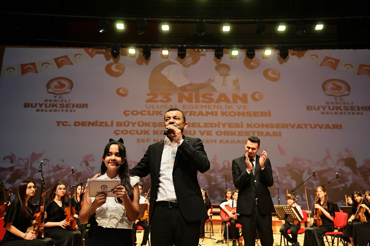 Ardından Pamukkale Kültür Merkezi Özay Gönlüm Salonu’nda sahne alan Denizli Büyükşehir Belediye Konservatuarı Çocuk Korosu ve Orkestrası, muhteşem performansı ile büyük beğeni topladı. Minik koristler, salonu dolduran seyircilerden büyük alkış aldı. Koro Şefi Görkem Karagün eşliğinde gerçekleşen konserde sahne alan çocuklar söyledikleri birbirinden güzel şarkı ve türkülerle büyüklere adeta taş çıkarttı. Denizli Büyükşehir Belediye Konservatuarı Çocuk Korosu ve Orkestrası’nın muhteşem performansına tanıklık eden davetliler de hep birlikte şarkı ve marşlara eşlik ederek 23Nisan Ulusal Egemenlik ve Çocuk Bayramı coşkusunu hep birlikte yaşadı.