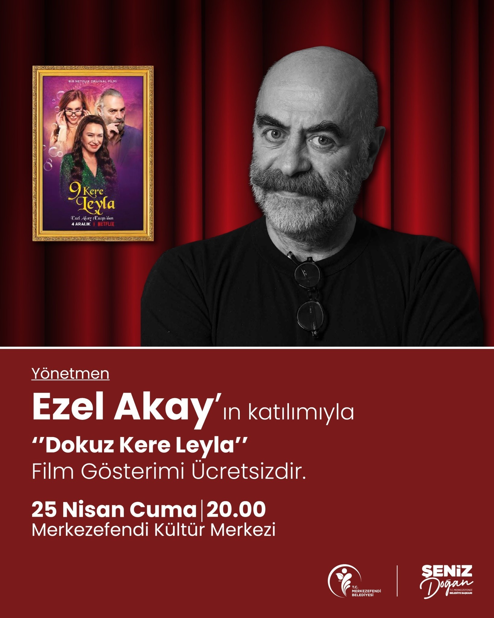 Kültür ve sanat etkinliklerine hız kesmeden devam eden Merkezefendi Belediyesi, sinemaseverleri özel bir etkinlikle buluşturuyor. Merkezefendi Belediyesi, Yönetmen Ezel Akay’ın katılımıyla gerçekleşecek olan ‘Dokuz Kere Leyla’ filminin gösterimi, 25 Nisan Cuma günü saat 20.00’de Merkezefendi Kültür Merkezi’nde ücretsiz olarak izleyicilerle buluşacak. Etkinlikte izleyiciler, hem filmin keyfini çıkarma hem de usta yönetmen Ezel Akay ile bir araya gelme fırsatı yakalayacak.