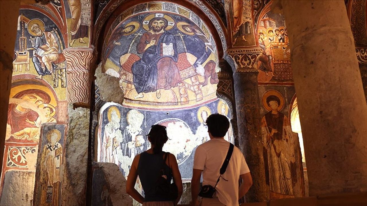Yaşam Haber - UNESCO Dünya Mirası listesindeki Göreme Açık Hava Müzesi'nin içinde yer alan Karanlık Kilise, İncil ve Tevrat'ta yer alan bazı sahnelerin 11. yüzyılın sonlarında duvar ve kubbelerine yansıtıldığı canlı renklerini muhafaza eden freskleri ile ön plana çıkıyor.