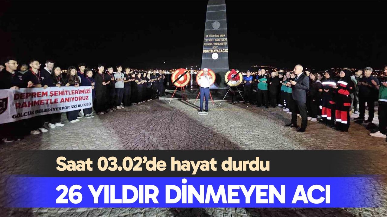 Gündem Haber - 17 Ağustos Depremi’nin 26. yıl dönümünde hayatını kaybedenler saat 03.02’de Gölcük’te anıldı. Kavaklı Sahili’nde bulunan anıt önünde düzenlenen programına Gölcük Deniz Ana Üs Komutanı Tuğamiral Yücel Korkut, Gölcük Kaymakamı Müfit Gültekin, Gölcük Belediye Başkanı Ali Yıldırım Sezer ve vatandaşlar katıldı. Anıtın önüne çelenk bırakma merasimi gerçekleşmesinin ardından depremde hayatını kaybedenler için dua edildi.