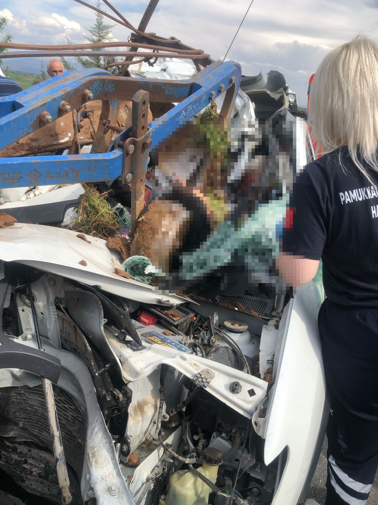 Denizli Haber - Denizli-Antalya karayolu Serinhisar ilçe girişinde bulunan Bölge Trafik Denetleme İstasyonu yakınlarında 21 Nisan günü meydana gelen kazada, 52 yaşındaki Duran Kef'in kullandığı otomobil, seyir halinde iken aynı yönde ilerleyen Remzi K. idaresindeki pulluk takılı olan traktöre arkadan çarptı. Demir pulluğun otomobili hurdaya çevirdiği kazada, sürücüyle birlikte araçta yolcu olarak bulunan 3 kişi yaralandı. Hastaneye kaldırılan yaralılardan, otomobilde yolcu konumunda bulunan Hatice Turhan (45), doktorların tüm müdahalesine rağmen kurtarılamadı.
