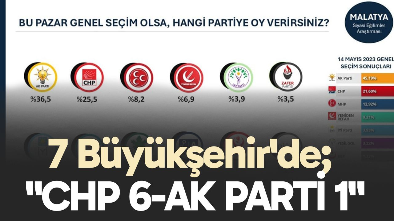 Öte yandan 2-8 Mayıs arasında 7 büyükşehirde yapılan ankette sadece bir büyükşehirde Ak Parti birinci parti oldu. Malatya'da Ak Parti yüzde 36.5 oy alırken CHP yüzde 25.5 oy oranında kaldı.