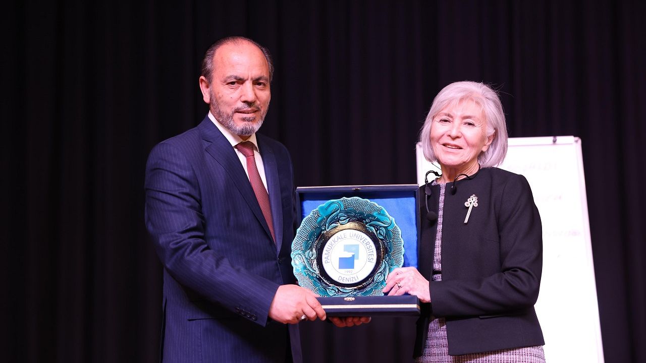 Konferansın sonunda ise Rektör Prof. Dr. Mahmud Güngör, Prof. Dr. Ayşen Baykara’ya hediye takdiminde bulundu.
