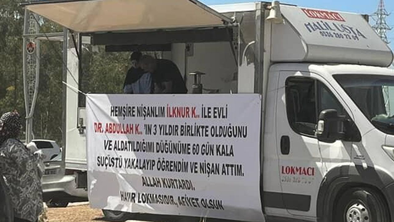 Gündem Haber-Adana'da düğününe 60 gün kala nişanlısı hemşire İlknur K.'nin, evli bir doktor olan Abdullah K. ile yaklaşık 3 yıldır gizli bir ilişki yürüttüğünü öğrenen genç adam, nişanı bozdu. Daha sonra bir tatlıcı ile anlaşan kişi, hemşire ve doktorun görev yaptığı Adana Şehir Eğitim ve Araştırma Hastanesi önünde lokma dağıttı. Araç önüne yerleştirdiği pankartta ise "Aldatıldığımı düğünüme 60 gün kala suçüstü yakalayıp öğrendim ve Allah kurtardı. Hayır lokmasıdır, afiyet olsun" ifadelerine yer verdi. Lokma yiyip yazıyı okuyanlar hayrete düştü.