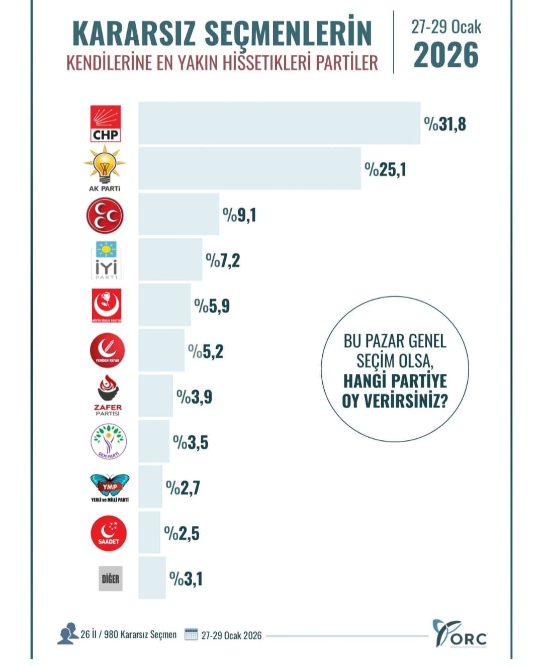 Son anket çalışmasında kararsız seçmenin nabzını ölçen ORC Araştırma, sonuçları kamuoyuyla paylaştı. 27-29 Ocak tarihlerinde 26 ilde 980 kişiye "Kendinize en yakın hissettiğiniz parti hangisidir?" sorusu yöneltildi. Alınan yanıtlara göre CHP yüzde 31,8 ile kararsız seçmenin en yakın hissettiği parti oldu. CHP'yi yüzde 25,1 ile AK Parti takip etti. MHP ise yüzde 9,1 ile üçüncü sırada yer aldı. Aynı ankette İYİ Parti yüzde 7,2 ile 4. sırada yer alırken, Büyük Birlik Partisi yüzde 5,9 oy oranı ile “kararsızların kendini yakın hissettiği” 5. Parti oldu.