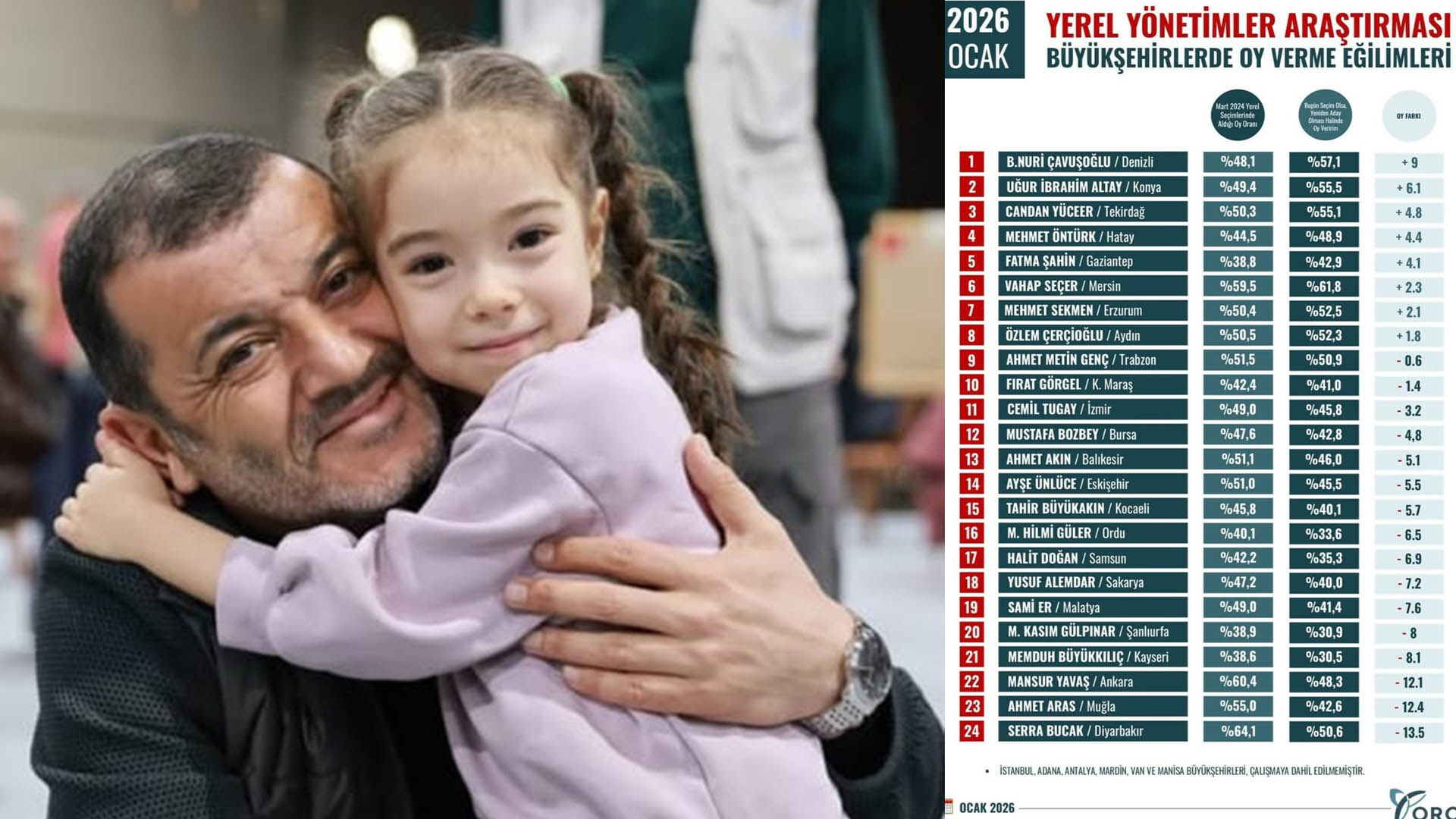 EKOPOLİTİK - Çok sayıda araştırma firması tarafından yapılan anketlerde 2024 ve 2025 yıllarında Türkiye ve Ege'de en başarılı belediye başkanı seçilen ve CHP Genel Başkanı Özgür Özel tarafından yerel yönetim uygulamaları sık sık referans gösterilen, “örnek başkan” ilan edilen Denizli Büyükşehir Belediye Başkanı Bülent Nuri Çavuşoğlu; “31 mart 2024 yerel seçimlerinden bu yana” 24 büyükşehir belediye başkanı içinde oyunu oransal olarak en fazla artıran belediye başkanı oldu.