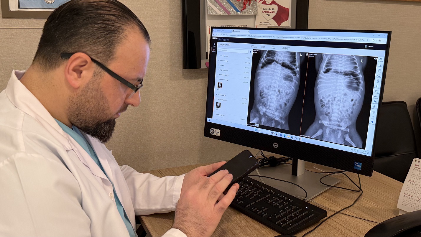 Op. Dr. Taner Kamacı, İHA muhabirine yaptığı açıklamada, anne karnındayken yapılan son ultrasonda bebeğin karnında sıvı olduğu tespit edilmesi üzerine hastadan haberdar olduklarını söyledi. Hastanın, karnında yaygın bir sıvı ile doğduğunu belirten Kamacı, bebeğin doğar doğmaz hemen değerlendirildiğini ve ultrasonlarını çekip muayenesini yaptıklarını ifade etti. Dr. Kamacı, çekilen ultrasonda bebeğin karnında sıvı olduğunu, çektikleri röntgen filminde de diyafram altı serbest hava olduğunu aktararak, "Bunları bir araya getirdiğimizde hastanın bağırsaklarında bir delinme olmuş olabileceğini düşündük. Hastayı doğduğu gün acil ameliyata aldık. Yaptığımız ameliyatta ince bağırsağının bittiği ve kalın bağırsağın başladığı yerde atrezi dediğimiz doğuştan bağırsağın kapalı olduğu, bundan kaynaklı ince bağırsağın en son kısmında bağırsağın delindiğini tespit ettik. Delinmeden dolayı da bağırsak içeriğinin karnına dolduğunu, ultrasondaki sıvının bu sıvı olduğunu tespit ettik" dedi.