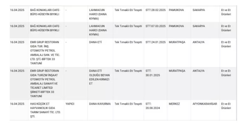 Listeye göre, Sakarya’nın Pamukova ilçesinde faaliyet gösteren Bağ Konakları Cafe’nin lahmacununda, Antalya Muratpaşa’daki EMR Grup Restoran’ın dana etinde ve “Yapıcı” marka dana kavurmada at ve eşek eti tespit edildi. Bu ürünler tüketiciye dana eti olarak sunuluyordu.