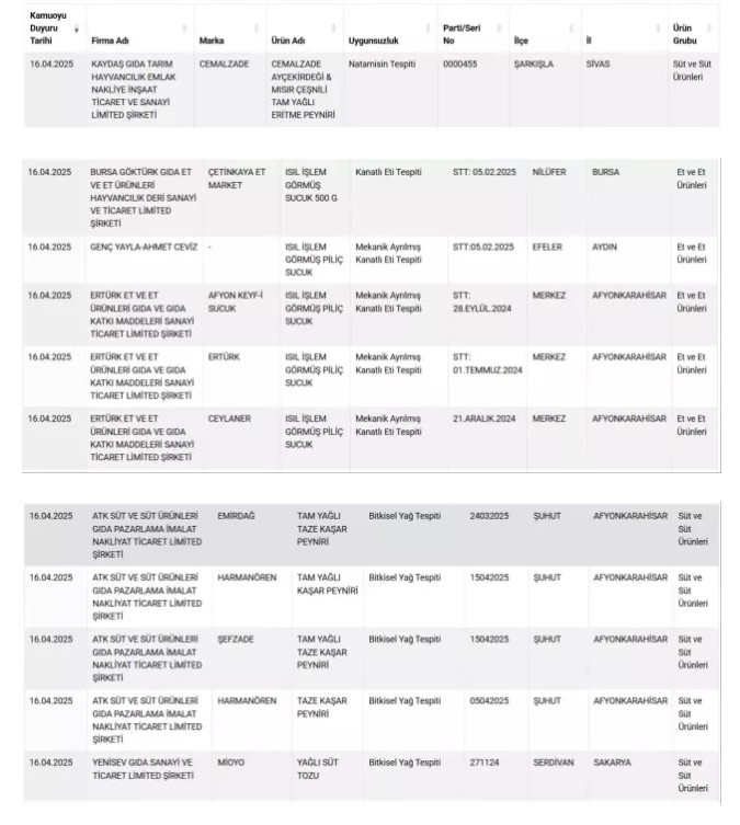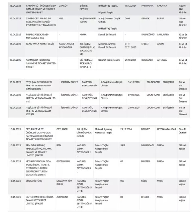 Bakanlığın yayımladığı listede sadece et ürünlerinde değil, birçok farklı kategoride de ciddi usulsüzlükler belirlendi. Şu ürünlerde de taklit ve tağşiş tespit edildi: