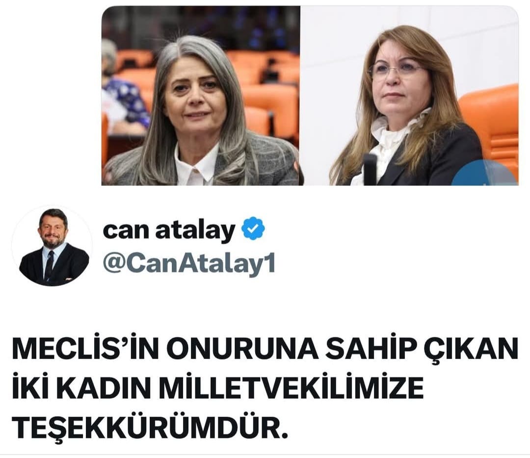Silivri'deki Marmara Cezaevinde 3 yılı geçen bir süredir tutuklu bulunan Can Atalay'ın, "Meclisin onuruna sahip çıkan iki kadın milletvekilimize teşekkürümdür" başlıklı açıklaması ise şöyle: Meclis’te, 30 Ocak 2024’te Anayasa Mahkemesi’nin iki kez “yargılaması durdurulsun, Can Atalay milletvekilliği görevine başlasın” hükmü hiçe sayıldı. Hükümsüz bir “Yargıtay yazısı” Genel Kurul’da okundu. Anayasa, yasa önemli değildir, önemli olan çoğunluktur anlayışıyla Hatay halkının 80bine yakın oyuyla verdiği milletvekilliği görevim fiili durumla engellendi. Anayasa Mahkemesi durumu yeniden görüşerek Şubat 2024’te Meclis’in uygulamasının “yok hükmünde” olduğuna hükmetti. Kararı Temmuz 2024’te Resmî Gazete’de yayımlandı. “Milletvekilliğimin Tartışılmazlığı” üzerine artık söylenecek bir söz, yapılacak bir işlem kalmamıştı. Nasıl “Yargıtay yazısı” Meclis’te okunduysa Anayasa Mahkemesi’nin Resmî Gazete’de yayımlanan ve Meclis’e de yollanan “kesin, herkesi bağlayıcı hükmü” de Meclis’te okunacak ve “Olay”a bir nokta konulacaktı. Meclis Başkanı tam sekiz ay Türkiye’nin tamamının öğrendiği, okuduğu kararı Meclis’ten sakladı. Tavrını değerlendirmeyeceğim, çünkü yapacağım teşekkürden tavrına ne anlam atfettiğim zaten anlaşılacaktır. Meclis’in kuruluşunun tam 105. Yılında iki cesur kadın milletvekili bu Anayasal ayıbın gölgesini Meclis’in üzerinden kaldırıp attı.