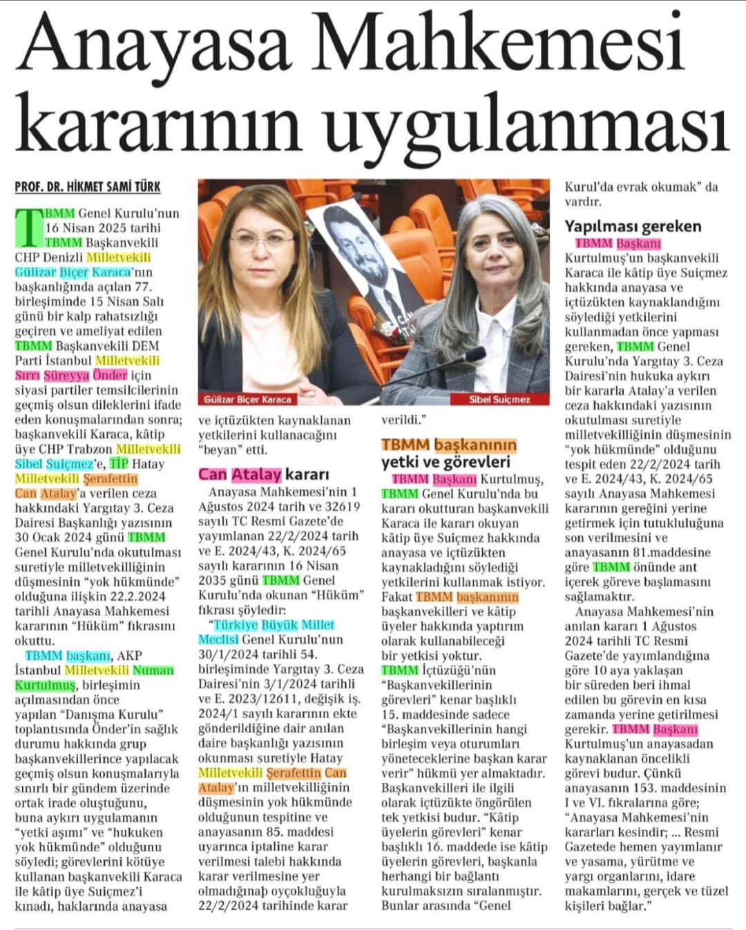 Mayıs 2023’de TİP Hatay Milletvekili seçilen ancak vekilliği düşürülen Gezi davası tutuklusu Can Atalay, Anayasa Mahkemesinin (AYM) hakkındaki hak ihlali kararının Meclis’te okunmasına dair açıklama yaptı. Atalay, sosyal medya hesabından paylaşılan açıklamasında, CHP'li TBMM Başkanvekili Gülizar Biçer Karaca ve Katip Üye Sibel Suiçmez’e teşekkür etti. "İnanıyorum ki ilgili oturum, 105 yıllık Meclis tarihinin en önemli olayları arasında yerini alacaktır. İki cesur kadın vekil çoğunluk gücüyle, fiili durum yaratılarak, olmadık demagojilerle Anayasa’nın ayaklar altına alınmasına ve Meclisin idarenin emrinde bir kurum durumuna düşürülmesine boyun eğmediler. Tavırlarıyla Meclisi onurlandırdılar" dedi. Öte yandan Adalet eski Bakanı Hikmet Sami Türk ise Cumhuriyet Gazetesi’nin “Olaylar ve Görüşler” bölümünde yer alan yazısında TBMM Başkanvekili Karaca ve Katip Üye Suiçmez’e arka çıktı. Türk “Anayasa Mahkemesi kararının uygulanması” başlıklı yazısında Meclis Başkanı Numan Kurtulmuş’un da görev ve yetkileri ile sınırlarını ortaya koydu. Başkanvekili Gülizar Biçer Karaca ile Katip Üye Sibel Suiçmez’in yasal ve yetki sınırları içinde gerçekleştirdikleri görevi detaylı bir şekilde anlattı.