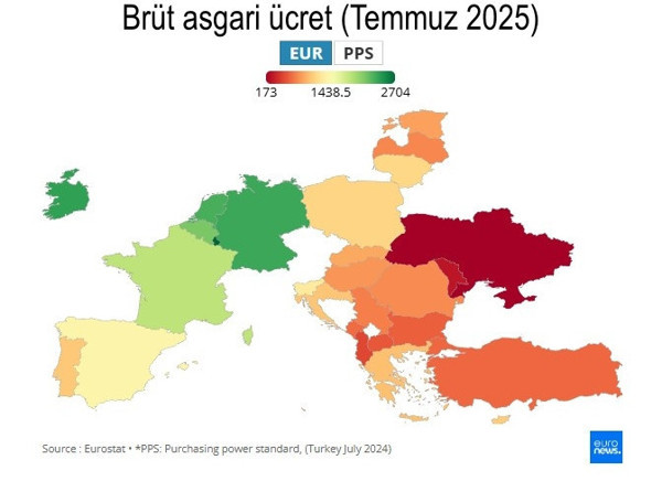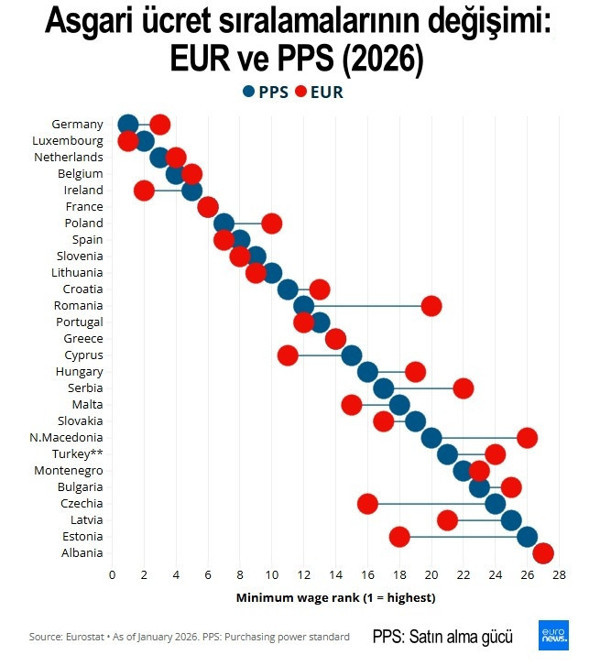 Ancak satın alma gücü paritesine (PPS) göre yapılan sıralamada Türkiye’nin konumu bir miktar iyileşiyor. Yaşam maliyetlerinin Euro bazında “görece” daha düşük olması nedeniyle Türkiye’nin asgari ücretinin reel alım gücü Euro bazlı sıralamaya kıyasla birkaç basamak yukarı çıkıyor. Buna rağmen Türkiye, Avrupa ortalamasının altında yer almaya devam ediyor.