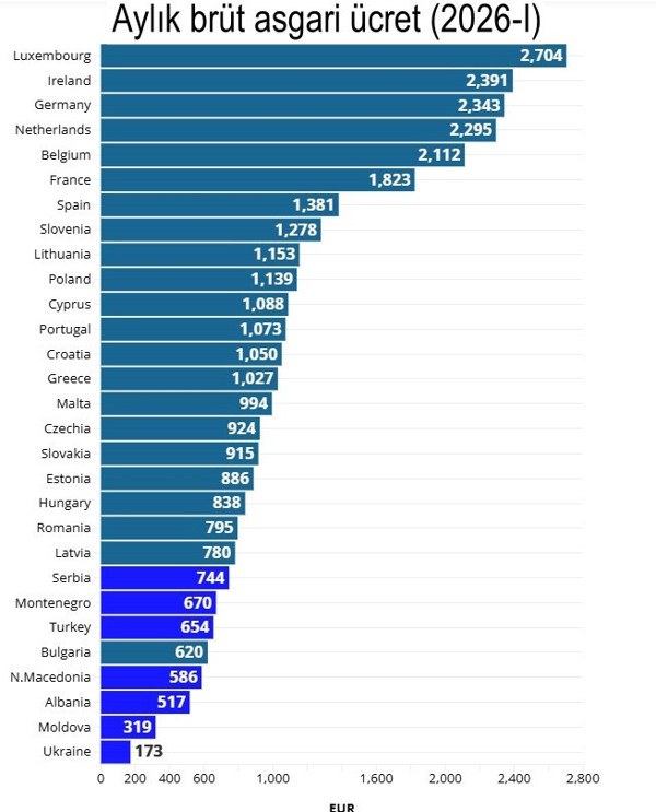 Türkiye’de 2026 yılı başı itibarıyla aylık brüt asgari ücret 654 Euro seviyesinde bulunuyor. Bu rakam, Avrupa ülkeleriyle karşılaştırıldığında Türkiye alt sıralarda yer alıyor.