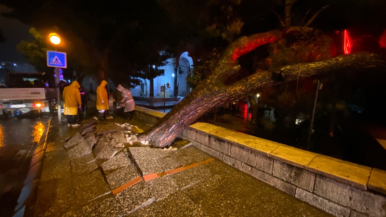 Gündem Haber- Olay, Cumhuriyet Mahallesi Adnan Menderes Bulvarı üzerindeki Bey Camii önünde saat 23.00 sıralarında meydana geldi. Edinilen bilgiye göre, gün boyunca süren sağanak yağmur nedeniyle zeminin yumuşaması sonucu kaldırımda bulunan asırlık çam ağacı kökünden sökülerek büyük bir gürültüyle devrildi. Yaya ve araç trafiğinin en yoğun olduğu bölgede yaşanan olayda, gece saatlerinde yolun boş olması muhtemel bir facianın önüne geçti. Ağacın devrildiğini gören vatandaşlar durumu 112 Acil Çağrı Merkezi'ne bildirdi. İhbar üzerine hızla olay yerine gelen polis ekipleri çevre güvenliği aldı. Aydın Büyükşehir Belediyesi Park ve Bahçeler Daire Başkanı Çağlar Tuğrul'un öncülüğündeki ekipler de ağacın bulunduğu yerden kaldırılması için çalışma başlattı. Ekiplerin çalışmaları sonucu ağaç kaldırılarak kaldırım yaya trafiğine açıldı.