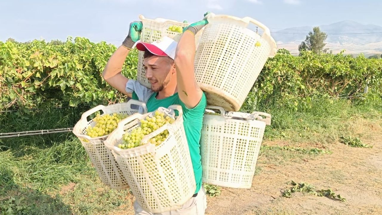Gündem Haber- Manisa’nın Sarıgöl Ovası’nda üzüm hasadı tüm hızıyla sürüyor. Bağlardan kesilen üzümler kasalara doldurularak kamyonlara taşınırken, kadın işçilerin "Haydi üzüm kalmadı" diye seslenmesi üzerine genç işçiler içleri üzüm doku seleleri sırtlayarak adeta yarış edercesine kamyonların yanına koşuyor.