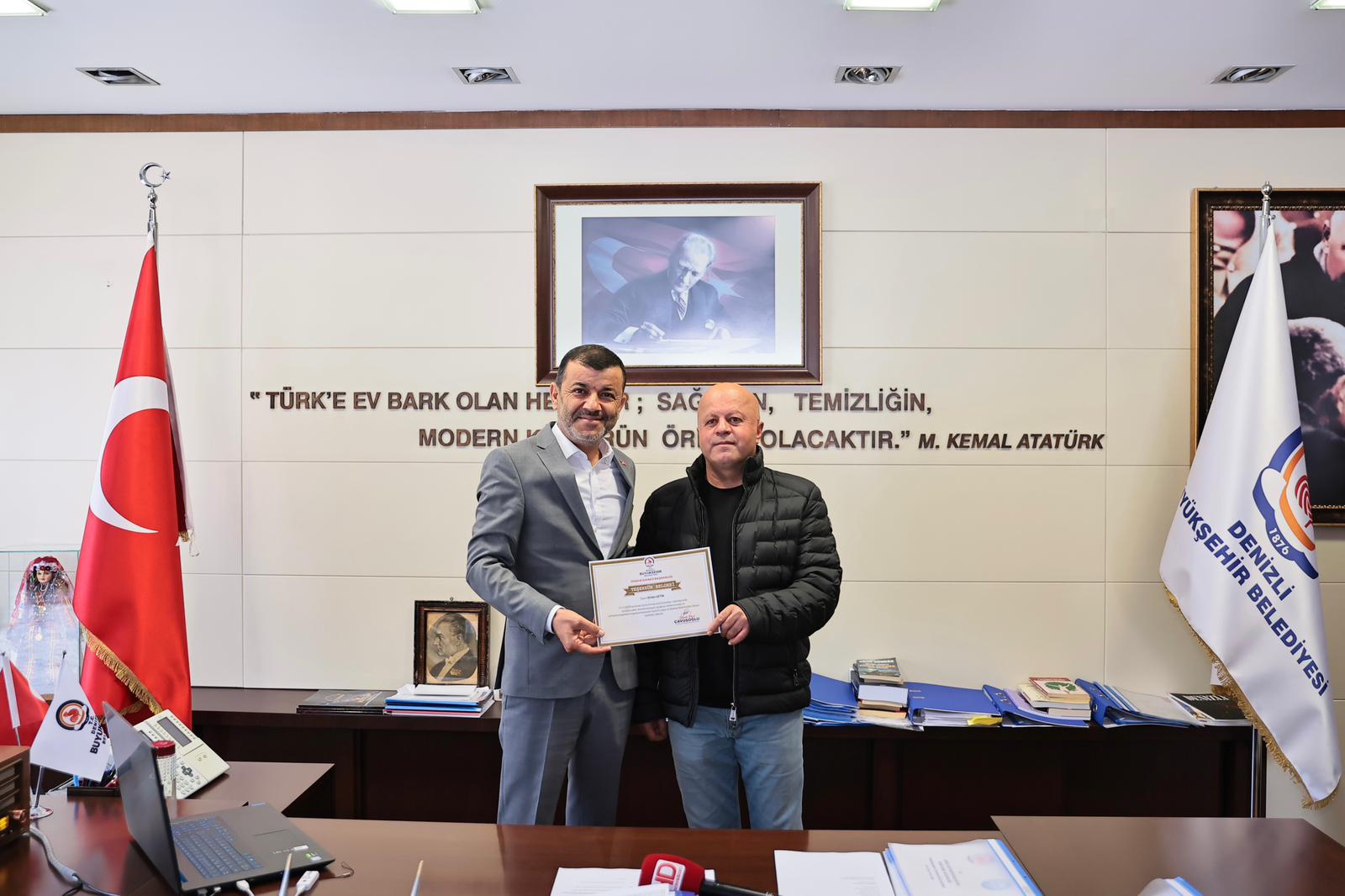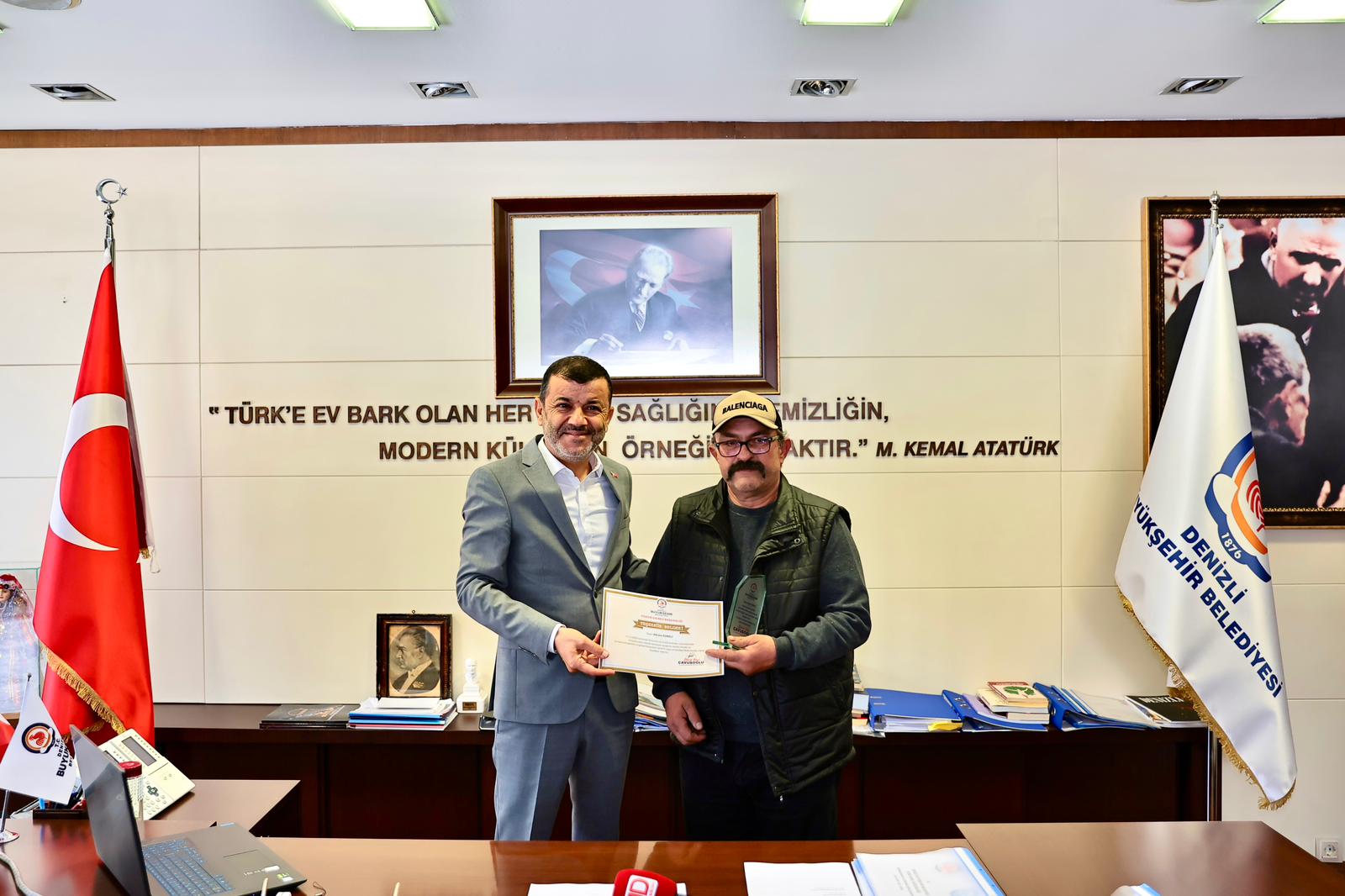 Denizli Haber - 11 Kasım 2025 Salı günü, Denizli'nin Honaz ilçesi Aydınlar Mahallesi'nde bulunan Akdere mevkiinde çıkan orman yangınına süt kamyonunda bulunan süt ile müdahale eden kahraman şoför Ekrem Eşmeli ve işletme sahibi Erkan Çetin, Denizli Büyükşehir Belediye Başkanı Bülent Nuri Çavuşoğlu’nu ziyaret etti. Ziyarette kısa bir konuşma yapan Başkan Çavuşoğlu, “Doğayı korumak hepimizin ortak sorumluluğu. Ekrem kardeşimiz, bir an bile tereddüt etmeden yangına müdahale ederek örnek bir davranış sergiledi. Bu şehirde yaşayan tüm vatandaşlar adına kendisine yürekten teşekkür ediyorum” dedi.