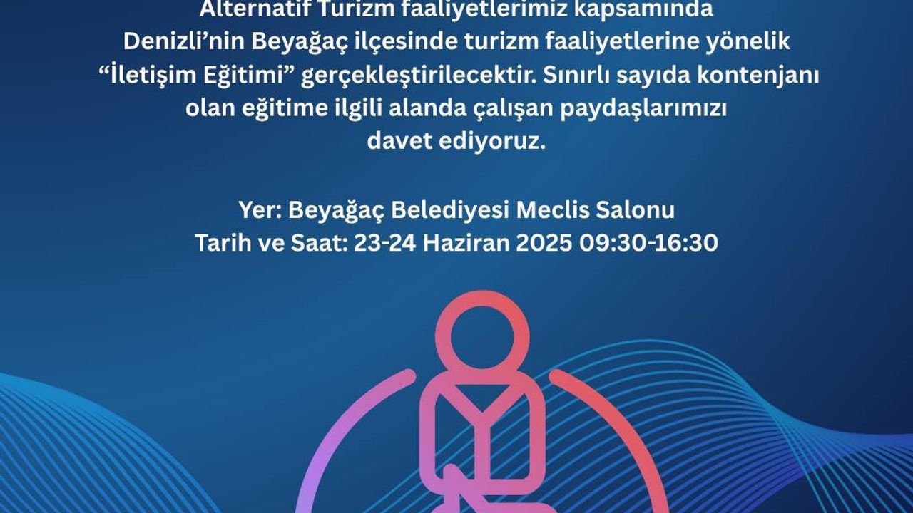 Denizli Haber - Beyağaç Belediyesi, Güney Ege Kalkınma Ajansı’nın "Yerel Kalkınma Hamlesi" programı ‘Alternatif Turizm’ faaliyetleri kapsamında, ilçe genelindeki turizm sektöründe faaliyet gösteren işletmeler ve çalışan paydaşlar için "İletişim Eğitimi" düzenliyor. Beyağaç Belediyesi Meclis Salonunda gerçekleşecek olan eğitimler, 23-24 Haziran 2025 tarihlerinde 09.30 ila 16.30 saatleri arasında devam edecek.