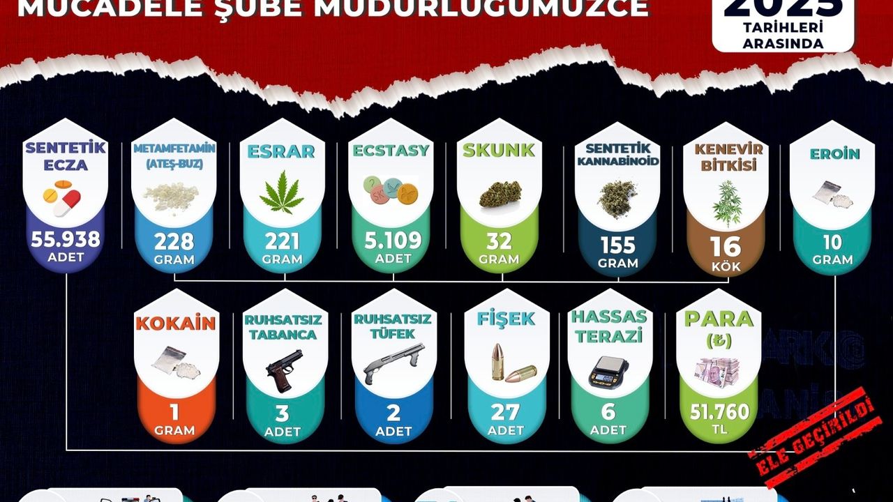 Operasyonlarda 769 bin 440 adet makaron, 55 bin 938 adet sentetik ecza hap, 5 bin 109 adet ecstasy hap, 228 gram metamfetamin, 221 gram esrar, 103 gram sentetik kannabinoid (bonzai) hammaddesi, 52 gram sentetik kannabinoid, 32 gram skunk, 10 gram eroin, 1 gram kokain, 16 kök Hint keneviri, 3 adet ruhsatsız tabanca, 2 adet ruhsatsız av tüfeği, 27 adet fişek, 6 adet hassas terazi ve 51 bin 760 TL uyuşturucu ticaretinden elde edildiği değerlendirilen para ele geçirildi.