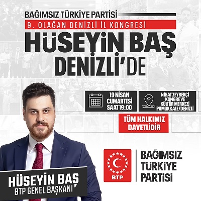 Bağımsız Türkiye Partisi İl Başkanlığı’ndan yapılan açıklamada, partilerinin 9. Olağan İl Kongrelerinin saat 19:00’da Nihat Zeybekci Kongre ve Kültür Merkezi salonlarında yapılacağı ve kongreye Bağımsız Türkiye Partisi( BTP) Genel Başkanı Hüseyin Baş’ın da katılacağı duyuruldu.