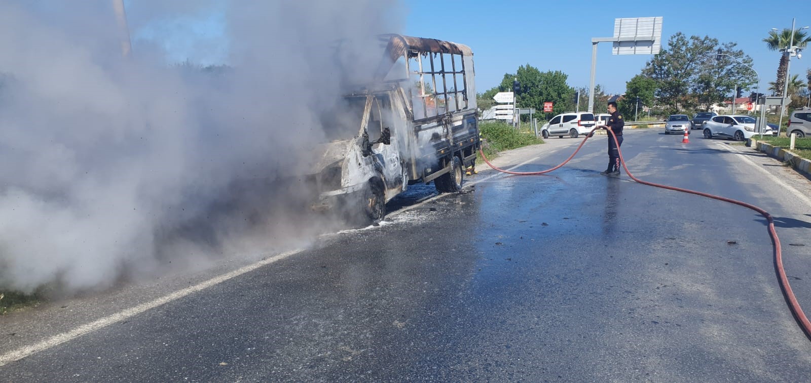 Edinilen bilgiye göre Kuşadası’nda yolda seyreden 5 yıldızlı bir otele ait çarşaf yüklü kamyonet, Soğucak Kavşağı’na geldiği sırada elektrik aksamından kaynaklı yaşanan arıza nedeniyle motor bölümünden alev aldı. Alevleri farkeden eden sürücü, aracı yol kenarına çekip, durumu polis ve itfaiye ekiplerine bildirdi. Kısa sürede olay yerine gelen itfaiye ekipleri alev topuna dönen kamyoneti söndürdü. Yangında araç kullanılamaz hale geldi.