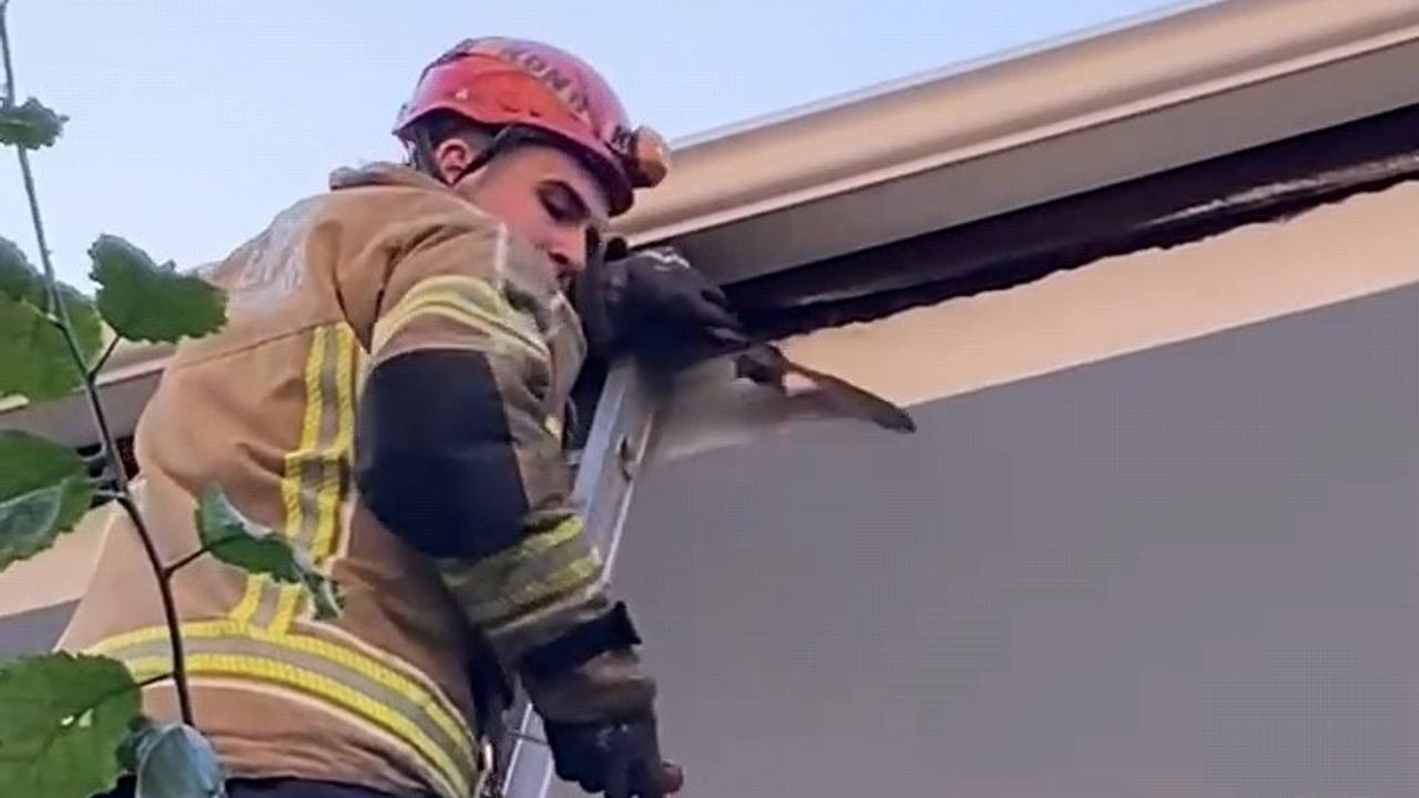 Kısa sürede olay yerine gelen itfaiye ekipleri, çatıya çıkarak yağmur suyu tahliye kanalını kontrol etti. Yapılan çalışmada ebabil kuşunun saçağa sıkıştığı tespit edildi. Titiz bir çalışmayla sıkıştığı yerden çıkarılan kuş, zarar görmeden kurtarıldı.
