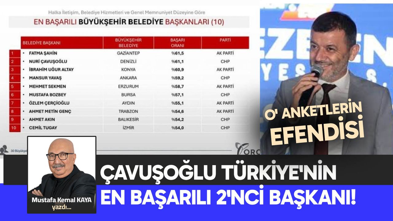 ORC Araştırma Şirketi'nin, 21-28 Ağustos tarihleri arasında 30 büyükşehirde 12 bin 600 kişiyle yaptığı anketin sonuçlarına göre Denizli Büyükşehir Belediye Başkanı Bülent Nuri Çavuşoğlu Türkiye’nin en başarılı 2. büyükşehir belediye başkanı oldu.