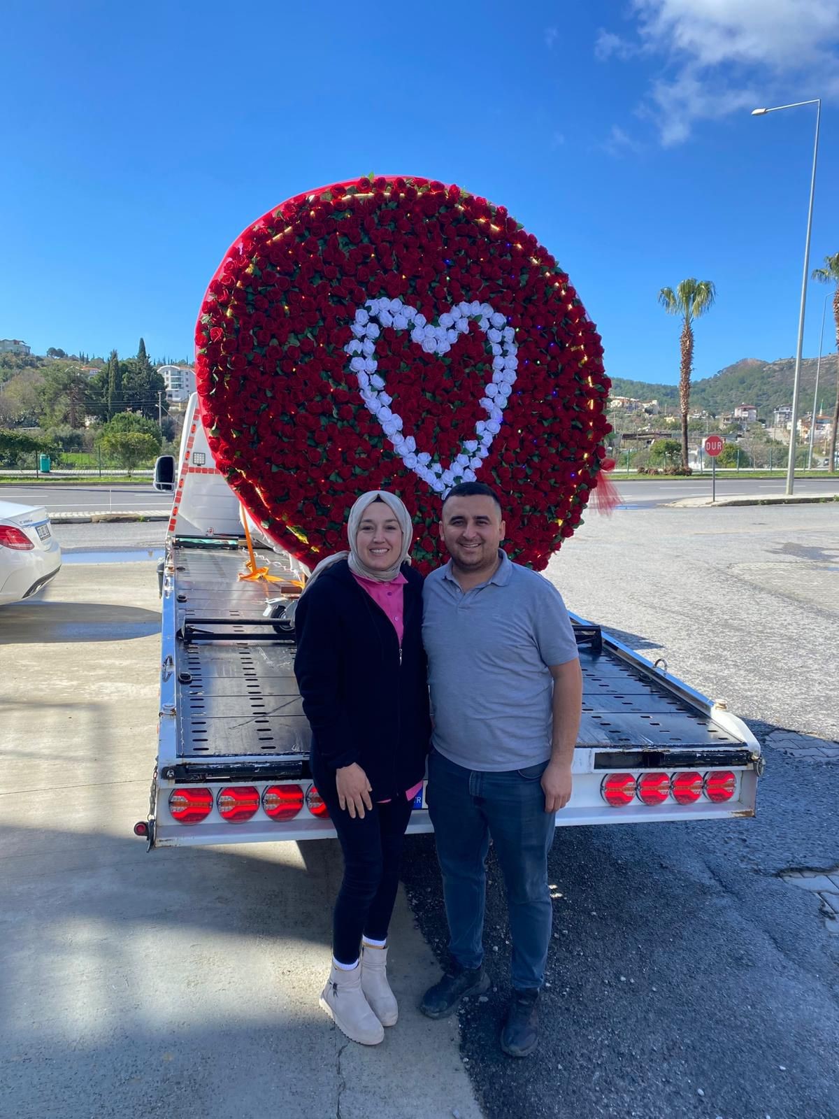 Araç platformu büyüklüğünde hazırlanan aranjman, özellikle ilçe merkezindeki ana arterlerde dikkat çekti. Kırmızı güllerle kaplanan yuvarlak tasarımın ortasında yer alan beyaz kalp figürlü dev arajmanı görenler cep telefonlarına sarıldı. Genç çiftler ve aileler dev kalbin önünde hatıra fotoğrafları çektirirken, sosyal medyada paylaşılan görüntüler kısa sürede yayıldı. Çekicinin Gazipaşa caddelerindeki görüntüsü dronla da kayıt altına alındı.