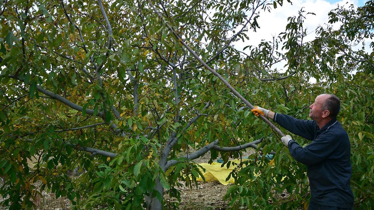 Gündem Haber - Hasadı gelen cevizler, ağaç silkeleme makinesiyle dallardan düşürülüyor ve yere serilen örtülerle toplanıyor. Daha sonra çuvallara konulan cevizler, kabuklarından ayrıldıktan sonra kurutulmak üzere güneşe seriliyor. Akdere Mahallesi'nde yaşayan 76 yaşındaki üretici Hüseyin Sönmez, 10 dönümlük tarlasında yetiştirdiği cevizlerin hasadını ailesi ve mahalle sakinleriyle birlikte imece usulüyle gerçekleştiriyor. Evli ve 3 çocuk babası olan Sönmez, ürettiği cevizleri başta İzmir olmak üzere birçok ile perakende olarak gönderiyor.