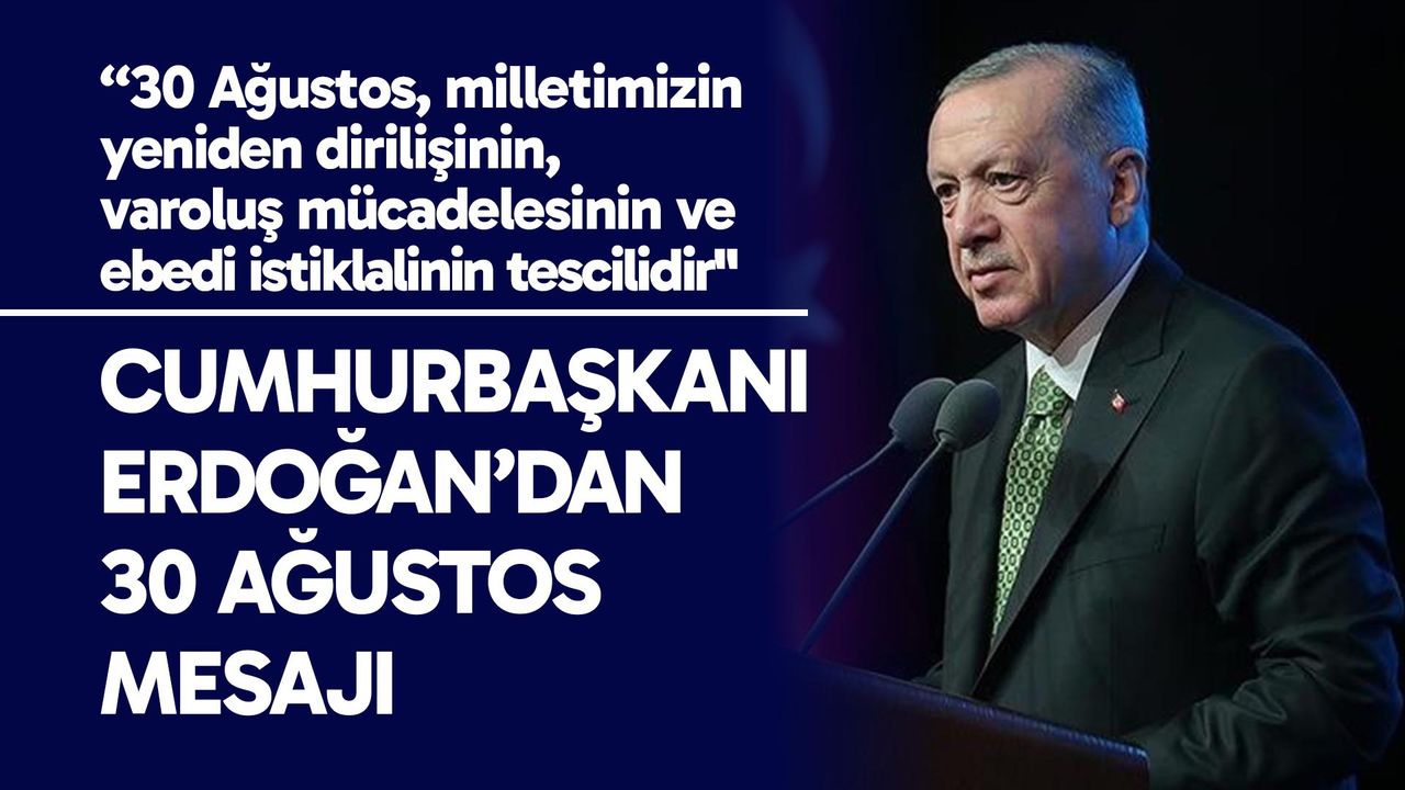 Mesajında, "Sevgili vatandaşlar, aziz milletim, tarihimizin dönüm noktalarından, altın sayfalarından biri olan 30 Ağustos Zafer Bayramı'nın gurur ve coşkusunu, milletçe bir kez daha yaşamanın mutluluğu içindeyiz." ifadelerini kullanan Erdoğan, bu aziz günün, Türk milletinin hürriyet ve istiklal uğruna ortaya koyduğu eşsiz iradenin, sarsılmaz inancın ve kahramanlığın en güçlü nişanelerinden biri olduğuna dikkati çekti.