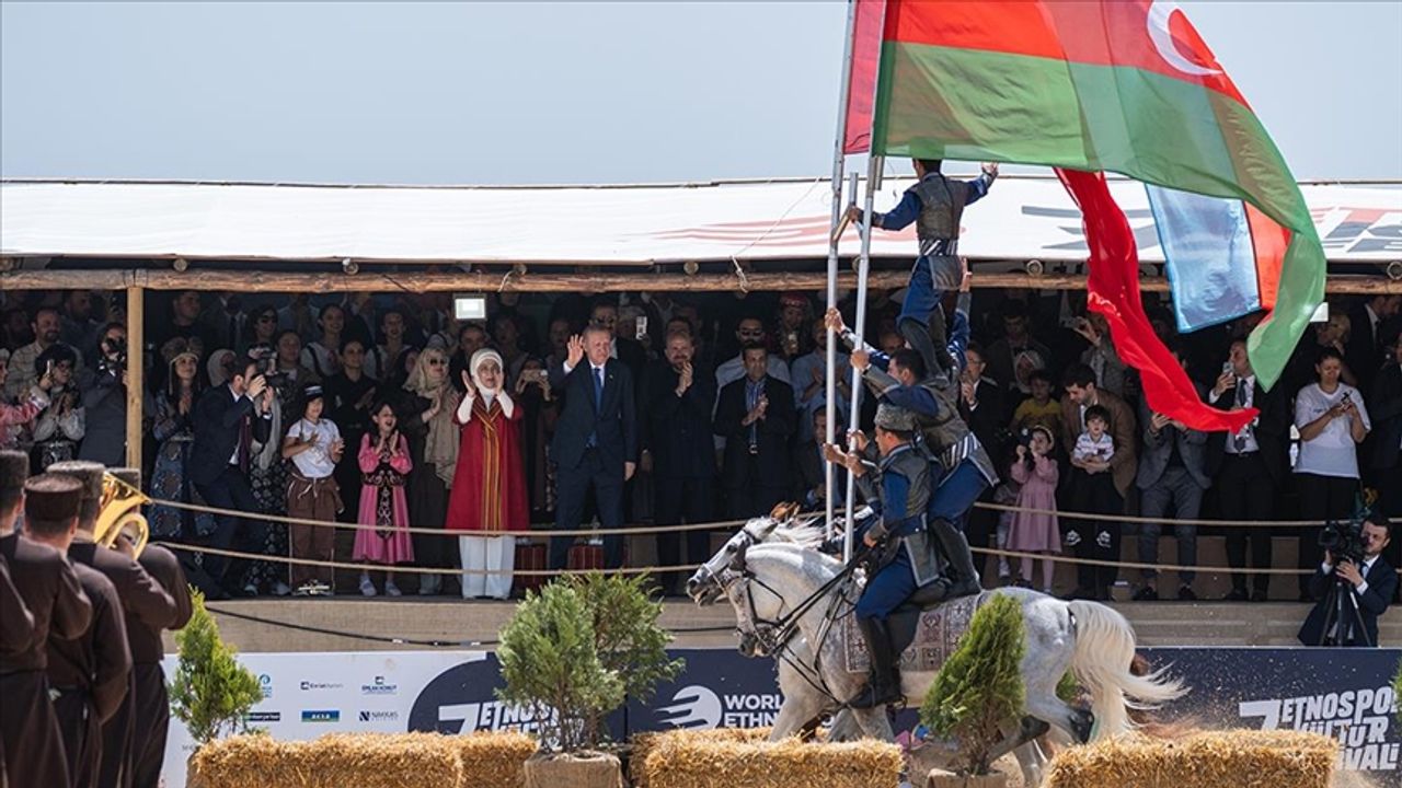 Gündem Haber - Cumhurbaşkanı Erdoğan, Dünya Etnospor Birliği tarafından düzenlenen ve Anadolu Ajansının (AA) global iletişim ortağı olduğu festivale ziyarette bulundu.Festival alanında yöresel oyunları da izleyen Erdoğan, Karabağ'dan gelen ekibin akrobatik at gösterisi sırasında Türk ve Azerbaycan bayrağını açtığı anları ayakta alkışladı.