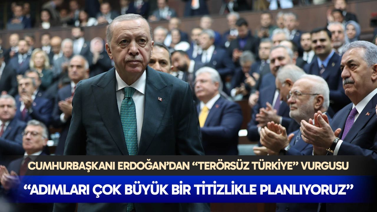 TBMM Başkanı Numan Kurtulmuş’un 'Terörsüz Türkiye Komisyonu'na başarıyla başkanlık ettiğinin altını çizen Erdoğan, "Meclis Başkanımız maruz kaldığı hadsizliklere ve edepsizliklere rağmen komisyonun bütün bu kıymetli çalışmalarına başarıyla riyaset etti. DEM Parti heyeti ve Grubu aynı şekilde gayet sağduyulu bir tavır içinde oldu. Cumhur İttifakı ortağımız Milliyetçi Hareket Partisi Genel Başkanı Sayın Devlet Bahçeli de ilk günden itibaren yaptığı cesur, ufuk açıcı, yol gösterici açıklamalarıyla sürecin bugünlere gelmesine eşsiz katkılar sağladı. Bizde gerek hükümet gerekse parti olarak son derece hassas bir çizgide yürüyerek sürece mihmandarlık yaptık. Elbette bu dönemde bilinen, bilinmeyen pek çok badireyi atlattık, pek çok sabotajı savuşturduk. Pek çok düğümü çözdük. Değerli kardeşlerim bütün bunlarla beraber dün biliyorsunuz komisyonumuz 17. toplantısını gerçekleştirdi. Milli Savunma Bakanımız, İçişleri Bakanımız ile MİT Başkanımız komisyonu ve milletvekillerimizi gelinen son aşamayla ilgili detaylıca bilgilendirdi. Sürecin selameti açısından yapılmasında fayda görülen hususlar komisyon üyeleriyle açık yüreklilikle paylaşıldı. Komisyonun fikir ve hedef birliği içinde çalışmasını son derece kıymetli buluyorum. Komisyonun terörsüz Türkiye süreciyle birlikte ülkemiz demokrasisine, birlik ve beraberliğimize, toplumumuzun farklı kesimleri arasında diyalog ve empatinin güçlendirmesine yaptığı katkıları takdirle karşılıyor, Meclis başkanımızı ve komisyon üyelerimizi canı gönülden tebrik ediyorum" dedi.
