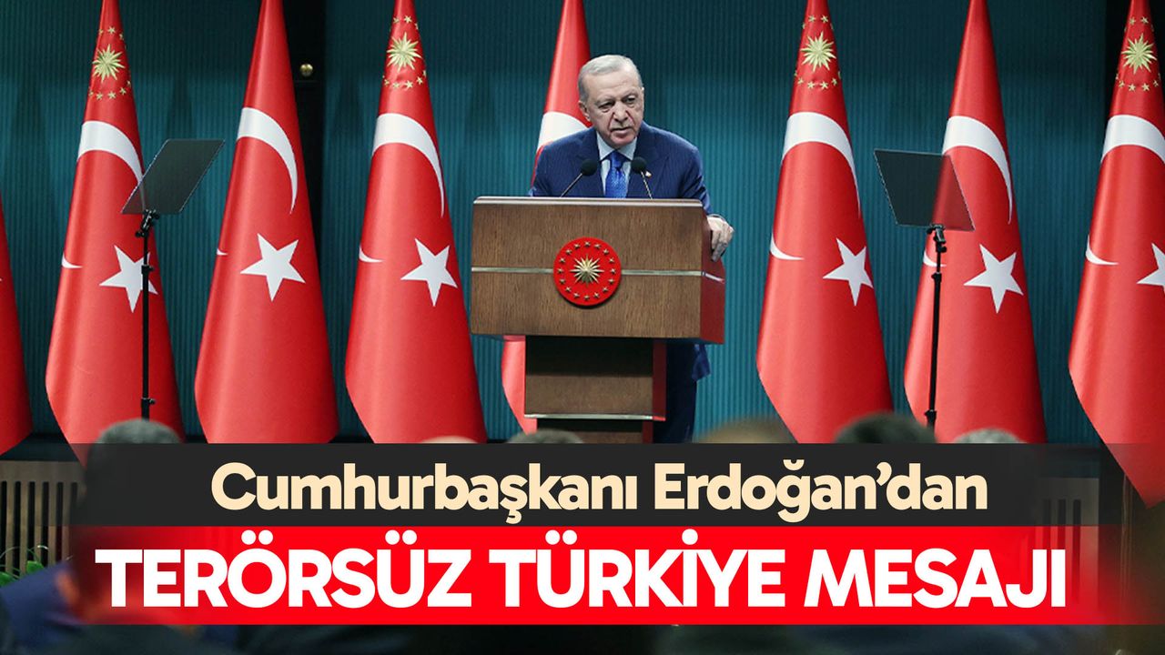 Türkiye’nin terör prangasından kurtulma mücadelesinin kısır çekişmelere ve farklı ikbal hesaplarına kurban edilmemesi gerektiğinin altını çizen Cumhurbaşkanı Erdoğan, "Siyasette pek çok şeyin kazası olur; ama bu konuda ayak diremenin, işi yokuşa sürmenin, süreci sulandırmaya çalışmanın mazereti olmaz. Bunu ne millet affeder, ne tarih affeder. Terörsüz Türkiye süreci, özellikle Anamuhalefet Partisi için "geçmiş günahlarına kefaret" olabilecek, bulunmaz bir fırsattır. Bu fırsatın değerlendirilmesi, bir nebze de olsa, yapılan hataların telafisine vesile olacaktır. Anamuhalefetin, sürece daha geniş bir mercekten bakarak, tarihin doğru tarafında konumlanması, milletimizin de beklentisidir. Siyaset kurumu, milletin müşterek menfaatleri söz konusu olduğunda, görüş ayrılıklarını bir süreliğine rafa kaldırıp, ortak zeminde bulaşacak, sorunlara diyalogla çözüm arayacak olgunluğa erişmiştir. Terörsüz Türkiye süreci, bunun için önemli bir referans olacaktır. Meclis Başkanımızın yürüttüğü çalışmaları, verdiği kapsayıcı ve uzlaştırıcı mesajları, bu bakımdan memnuniyetle karşılıyoruz"dedi.