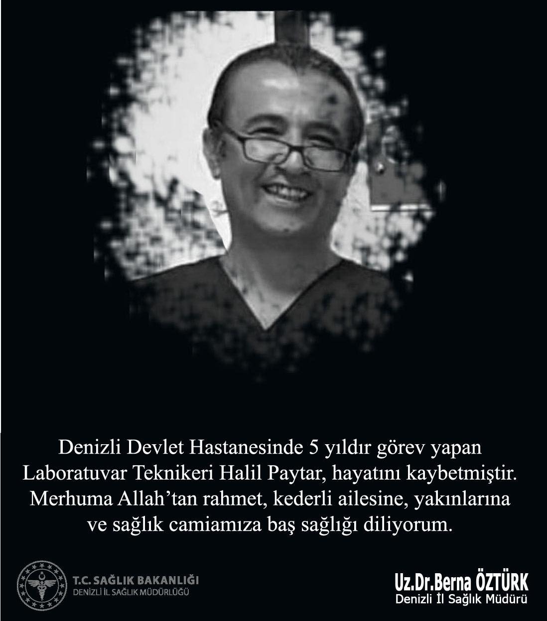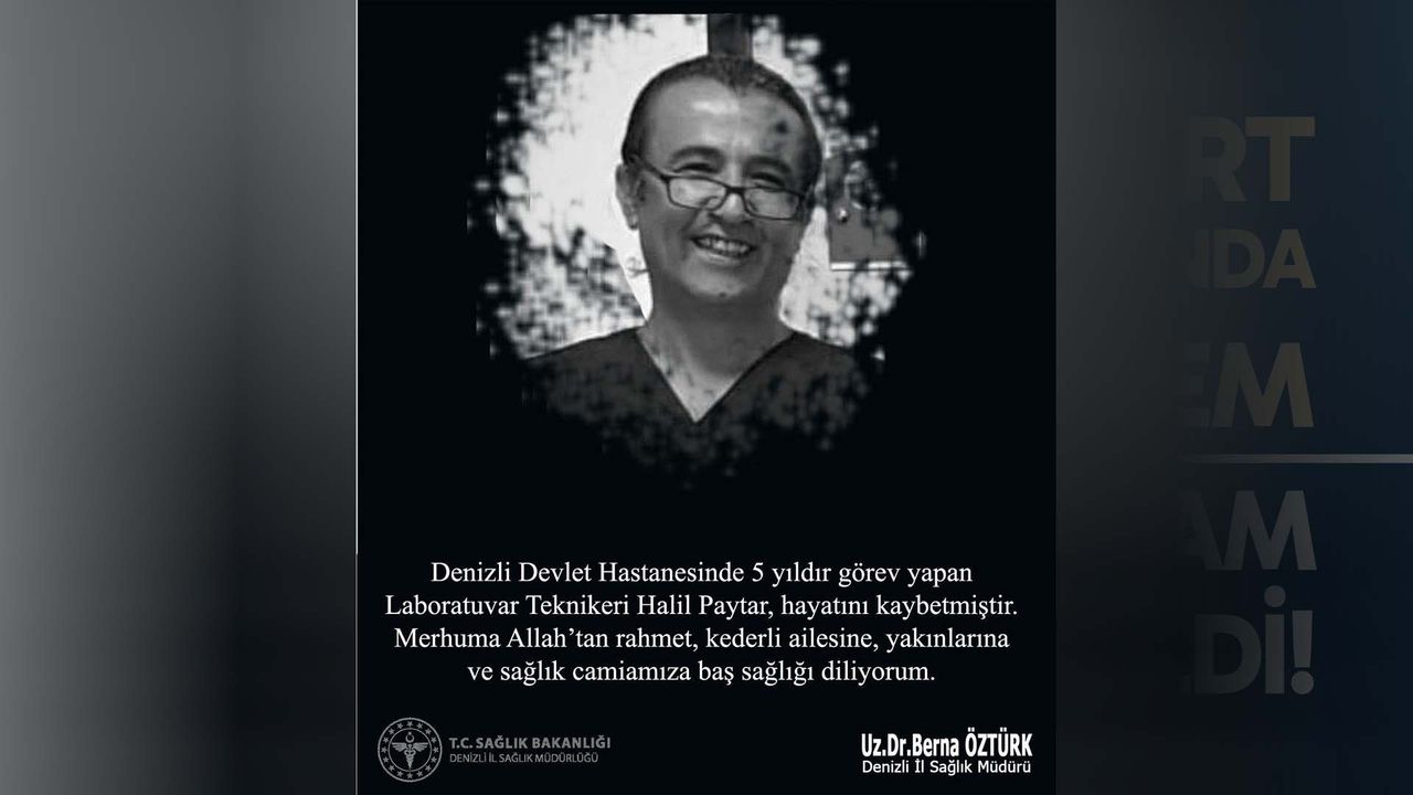 Denizli Haber - Denizli İl Sağlık Müdürü Uz. Dr. Berna Öztürk hayatını kaybeden personel için başsağlığı mesajı yayımladı. Öztürk mesajında “Denizli Devlet Hastanesi’nde 5 yıldır görev yapan Laboratuvar Teknikeri Halil Paytar hayatını kaybetmiştir. Merhuma Allah’tan rahmet kederli ailesine, yakınlarına ve sağlık camiamıza baş sağlığı diliyorum” dedi.