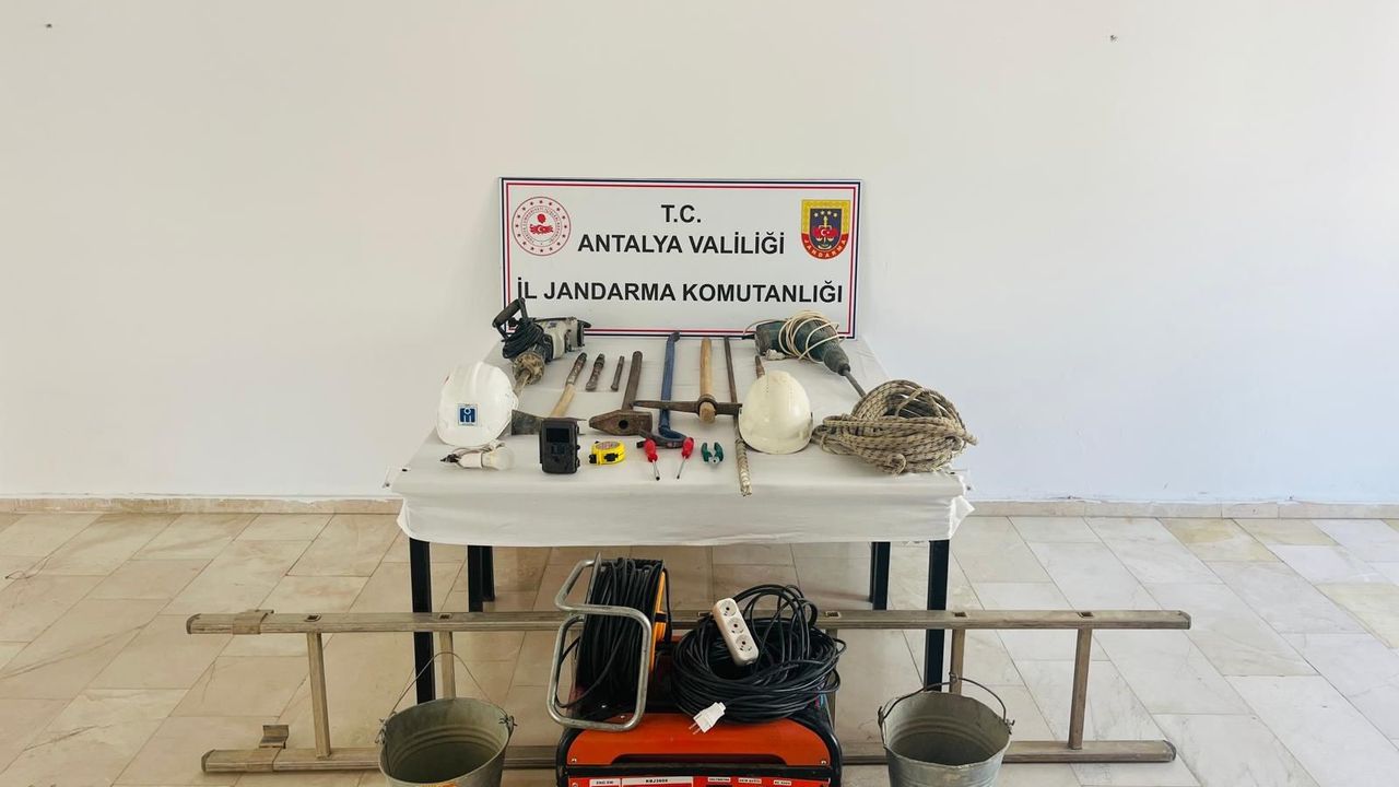 Ekipler, şüphelilerin yanlarında bulunan 1 adet jeneratör, 2 adet delici matkap, 1 adet fotokapan, 2 adet plastik baret, 1 adet çapa, 1 adet balyoz, 1 adet manille, 1 adet kazma, 1 adet 5 metre seyyar lamba, 1 adet 20 metre ip, 1 adet 50 metre seyyar elektrik kablosu, 7 adet delici matkap ucu, 1 adet 100 metre seyyar elektrikli makaralı kablo, 1 adet pense, 2 adet tornavida, 1 adet 2,5 metre merdiven ve 2 adet kovaya el koydu.