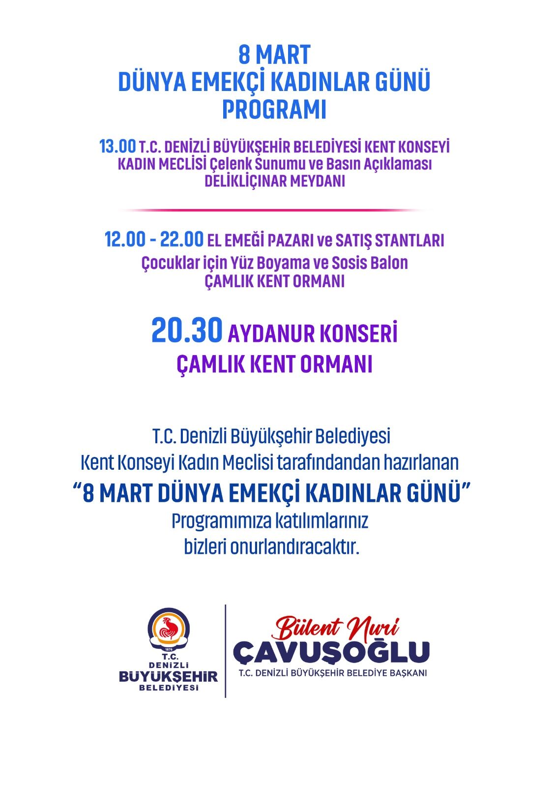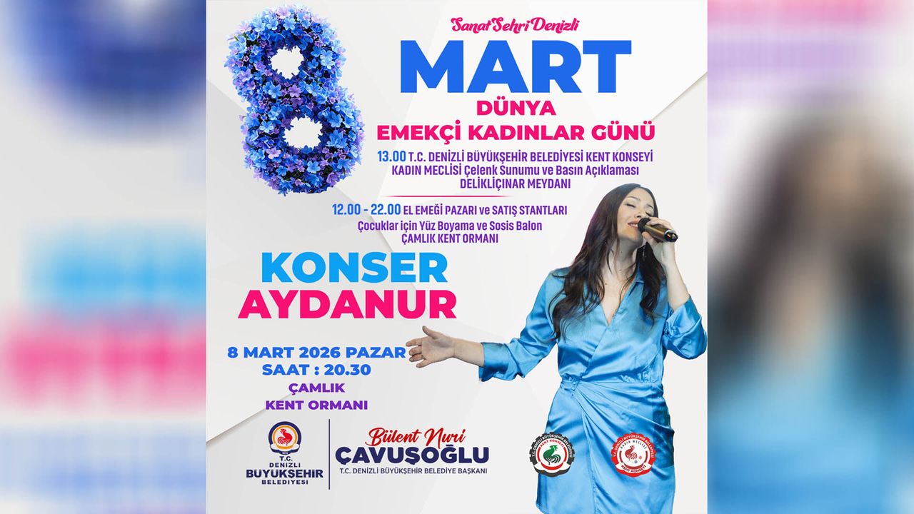 8 Mart Dünya Emekçi Kadınlar Günü programı, saat 20.30’da Çamlık Kent Ormanı’nda gerçekleştirilecek Aydanur konseriyle sona erecek. Denizli Büyükşehir Belediyesi Kent Konseyi Kadın Meclisi tarafından hazırlanan 8 Mart Dünya Emekçi Kadınlar Günü programına başta kadınlar olmak üzere tüm Denizlililer davet edilirken, etkinliklerin kadın emeği ve dayanışmasına dikkat çekmesi hedefleniyor.