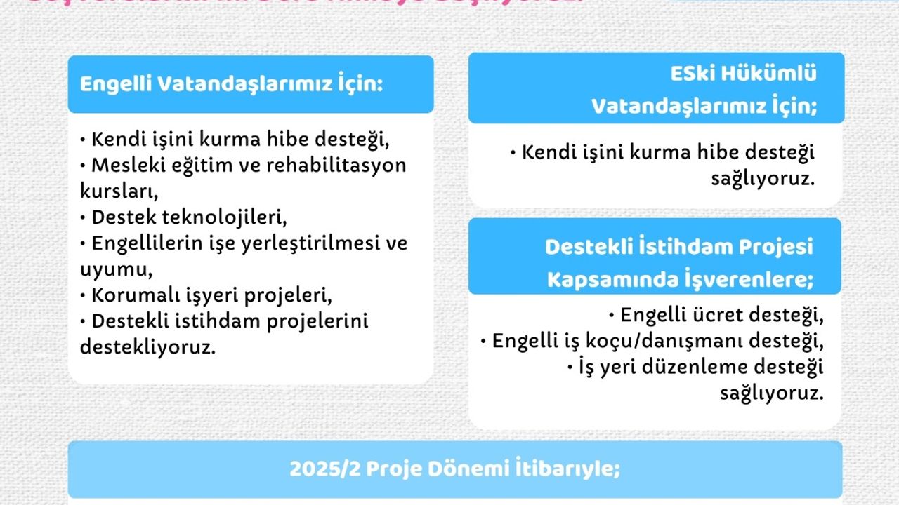 Denizli Haber- Denizli Çalışma ve İş Kurumu (İŞKUR) İl Müdürlüğü, 2025/2. dönem engelli ve eski hükümlülere yönelik proje başvurularının başladığını duyurdu. Kendi işini kurmak isteyen engelli ve eski hükümlü vatandaşlara yönelik sunulan hibe destekleriyle istihdamın artırılması hedefleniyor.