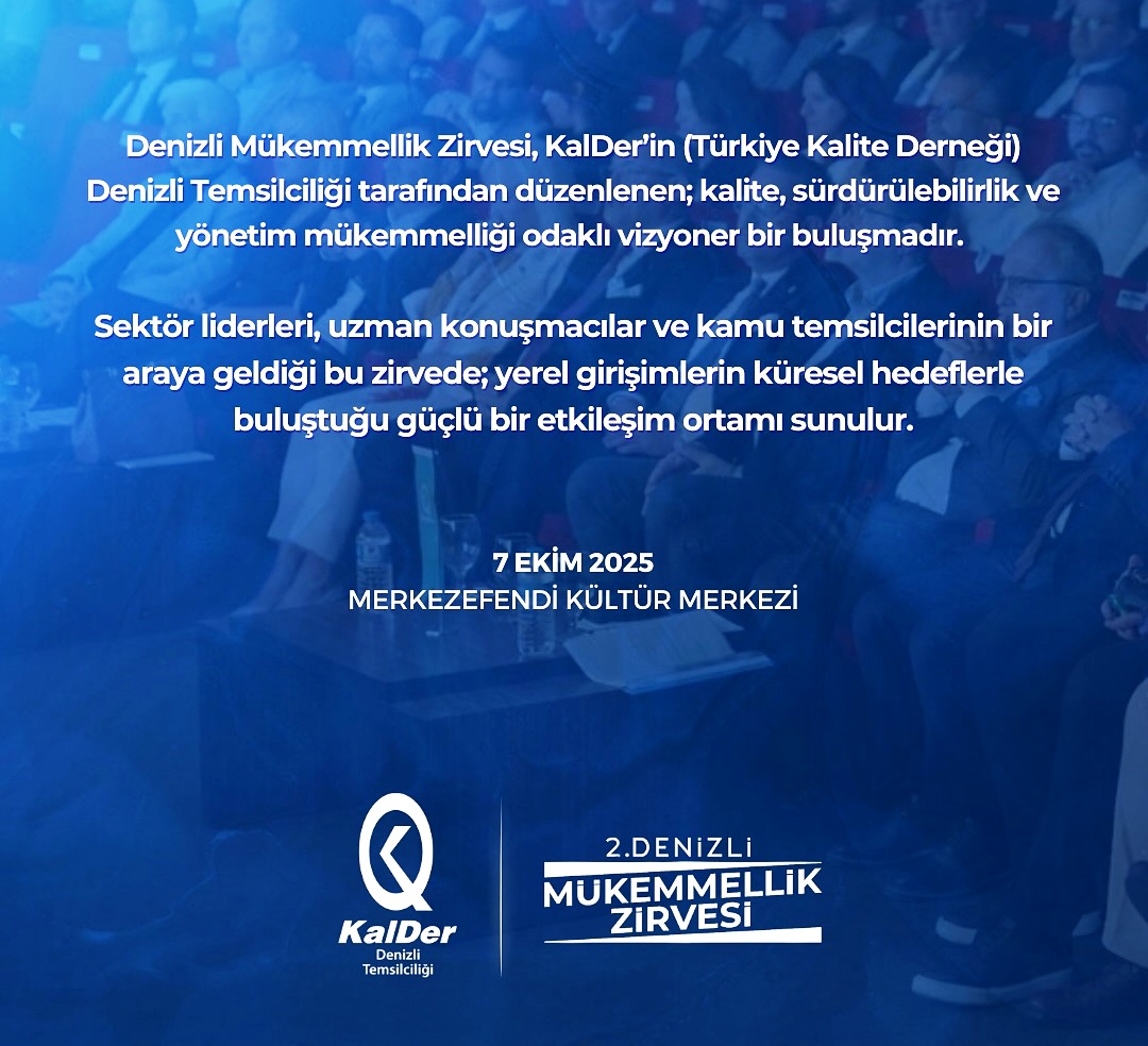 Denizli Mükemmellik Zirvesi, KalDer’in (Türkiye Kalite Derneği) Denizli Temsilciliği tarafından düzenlenen; kalite, sürdürülebilirlik ve yönetim mükemmelliği odaklı vizyoner bir buluşma. Sektör liderleri, uzman konuşmacılar ve kamu temsilcilerinin bir araya geldiği zirvede; yerel girişimlerin küresel hedeflerle buluştuğu güçlü bir etkileşim ortamı oluşuyor. İlki geçtiğimiz yıl “Geç Olmadan: Değişim ve Dönüşüm” temasıyla gerçekleşen Denizli Mükemmellik Zirvesi; 650’den fazla katılımcıyla Denizli’nin en kapsamlı kalite ve sürdürülebilirlik etkinliği oldu. KalDer’in 35 yıllık deneyimiyle desteklenen bu zirve, sektörlerin geleceğini şekillendirmek için ortak akıl ve ilham verici örneklerle dolu bir alan sunuyor. 2. Denizli Mükemmellik Zirvesi 7 Ekim 2025 Salı günü yapılacak.