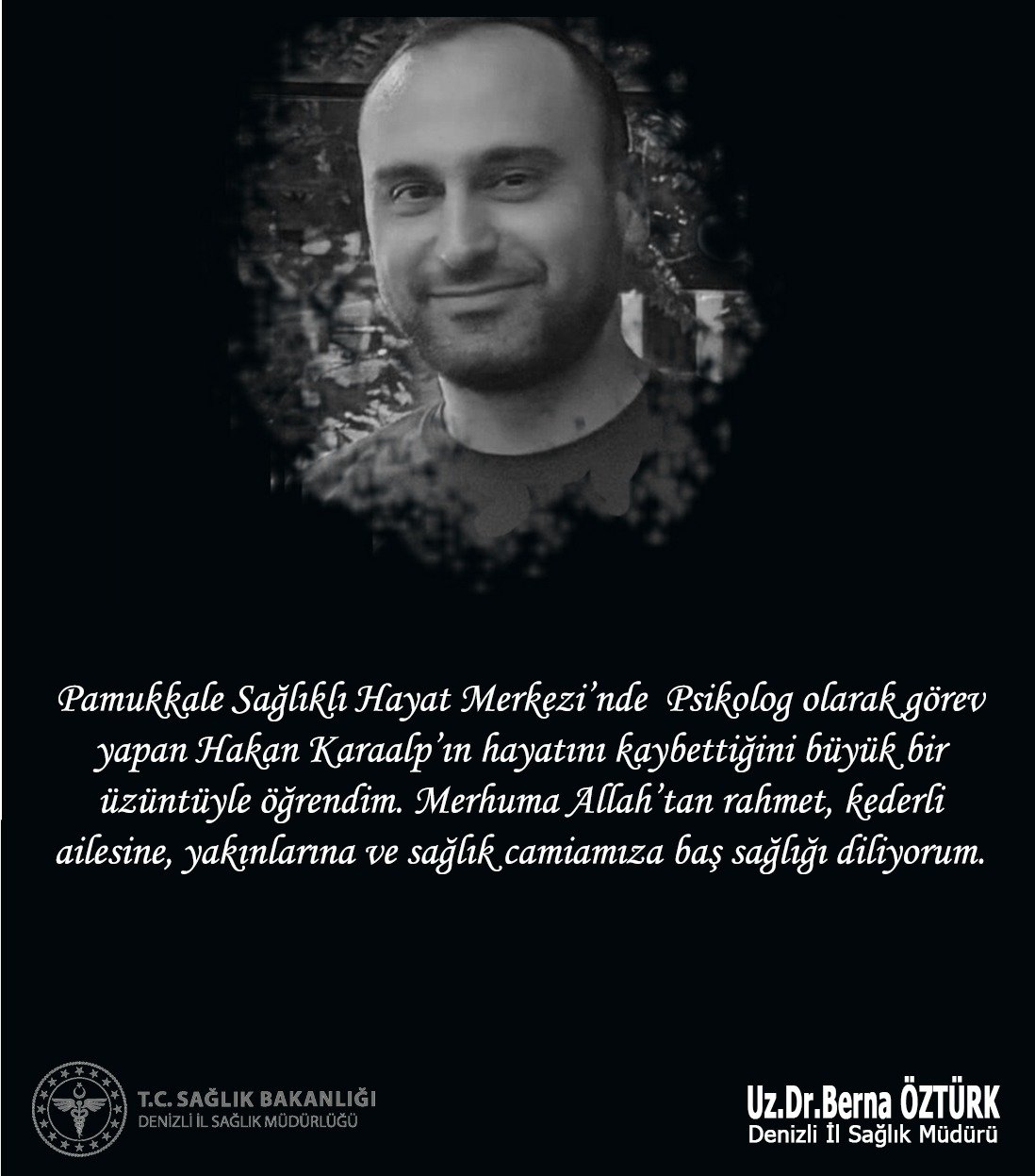 Denizli Haber - Denizli Pamukkale Sağlıklı Hayat Merkezi Psikologlarından olan Hakan Karaalp'in kaybı ile ilgili paylaşım yapan Denizli İl Sağlık Müdürü Uz. Dr. Berna Öztürk, “Pamukkale Sağlıklı Hayat Merkezi’nde Psikolog olarak görev yapan Hakan Karaalp’ın hayatını kaybettiğini büyük bir üzüntüyle öğrendim. Merhuma Allah’tan rahmet, kederli ailesine, yakınlarına ve sağlık camiamıza baş sağlığı diliyorum" ifadelerini kullandı.