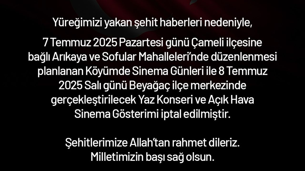 Denizli Haber - Bu kapsamda, 7 Temmuz 2025 Pazartesi günü Çameli ilçesine bağlı Arıkaya ve Sofular Mahalleleri’nde düzenlenmesi planlanan Köyümde Sinema Günleri ile 8 Temmuz 2025 Salı günü Beyağaç ilçe merkezinde gerçekleştirilecek Yaz Konseri ve Açık Hava Sinema Gösterimi iptal edildi.