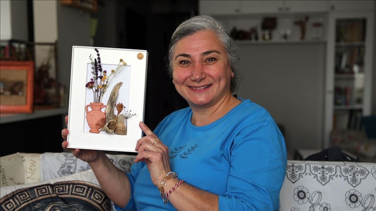 İl Kültür ve Turizm Müdürlüğünde arkeolog olarak çalışan 52 yaşındaki Songül Erbay, ileride tablo yapma düşüncesiyle 25 yıl boyunca görev yaptığı kazı alanlarında yaprak, taş, ölü böcek ve dal gibi malzemeleri topladı.