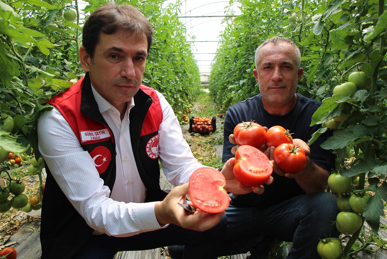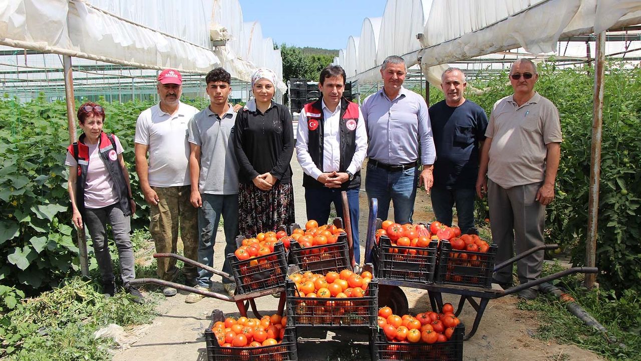 Köy muhtarı Halil İbrahim Kara ile köyde ilk domates hasadı yapan çiftçilerden olan Mehmet Türkmen ise Mart ayında toprakla buluşturdukları günden bu yana büyük emeklerle yetiştirdikleri domateslerinin doğrandığında yaydığı koku, lezzeti, aroması ve rengiyle de göz doldurduğunu işaret ettiler.