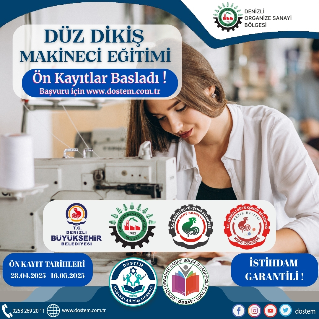 Dostem Mesleki Eğitim Merkezi’nde gerçekleştirilecek eğitim, 20 Mayıs 2025 Salı günü başlayacak. Toplam 336 ders saatinden oluşan ve hafta içi her gün düzenlenecek olan kurs, 30 gün sürecek. Eğitim sonunda tüm katılımcılara Eğitim Katılım Belgesi verilecek. Ayrıca, eğitimi başarıyla tamamlayan ve çalışmak isteyen kursiyerlere Denizli Organize Sanayi Bölgesi’ndeki firmalarda istihdam imkânı sunulacak.