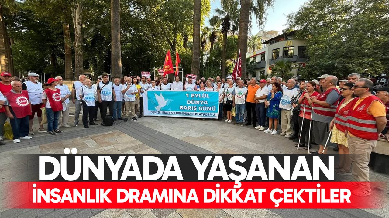 Denizli Haber - Denizli Emek ve Demokrasi Platformu tarafından Candoğan Parkı önünde düzenlenen basın açıklamasına CHP İl Başkanı Ali Osman Horzum, Denizli Emek ve Demokrasi Platformu üyeleri katıldı. 1 Eylül Dünya Barış günü nedeniyle grup adına açıklama yapan KESK Denizli Şubeler Platformu Dönem Sözcüsü Yusuf Yurdakul, yaşanan savaşlara dikkat çekti ve insanlığın bu vahşete sessiz kalmasının vahim bir tablo olduğunu vurguladı.