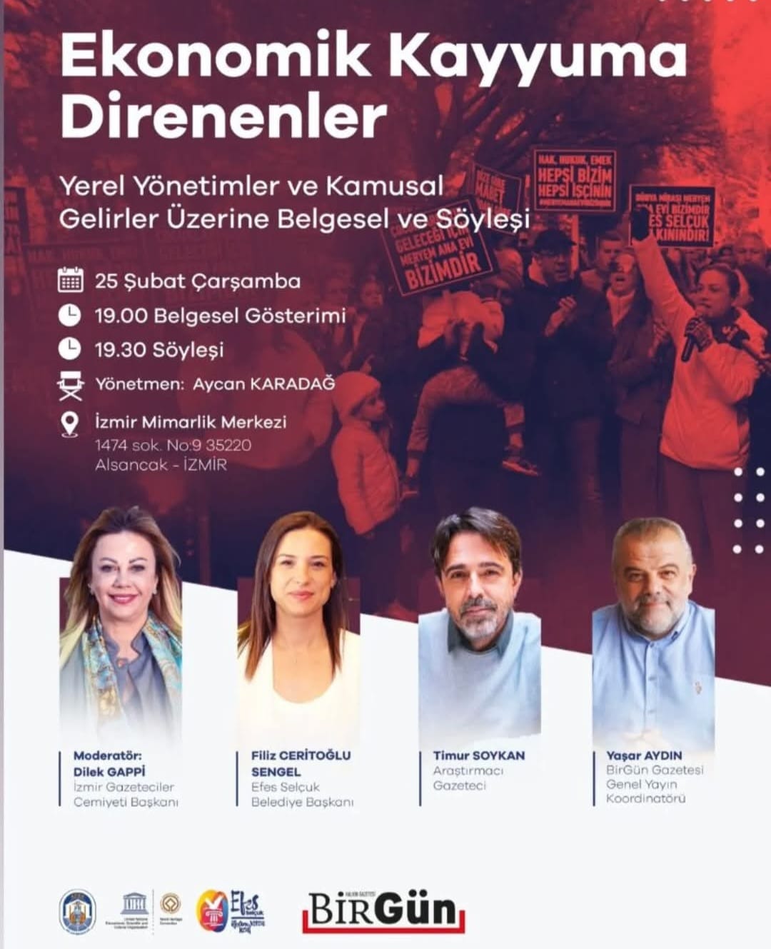 BirGün Gazetesi’nden Aycan Karadağ’ın hazırlayıp yönetmenliğini yaptığı belgeselde, Efes Selçuk’un Meryem Ana Evi Direnişi; halk, belediye emekçileri ve kent esnafı tarafından tüm yönleriyle anlatılıyor. Efes Selçuk Belediyesi’nin Türkiye’de ekonomik kayyum uygulanan ilk belediye olduğunu belirten Efes Selçuk Belediye Başkanı Filiz Ceritoğlu Sengel; “Meryem Ana Evi Otopark gelirleri 2024 yılının Kasım ayında Efes Selçuk Belediyesi’nden aslına bakarsanız Efes Selçuk halkının elinden alındı. Bu gelirler; 1970’lerden bu yana Efes Selçuk Belediyesi’nin vermiş olduğu hizmetler, sağladığı sosyal destekler, kurumun emekçilerine ödediği maaşlar olarak sadece belediye için değil, Efes Selçuk halkı için de hayati önem arz eden gelirlerdir. İşte biz Birgün Gazetesi’nin ev sahipliğinde bu gelirlerin elimizden sökülerek alınmasının hikayesini bir belgesel ve söyleşi ile tüm İzmir’e ve tüm Türkiye’ye anlatacağız. Meryem Ana Evi otopark gelirlerinin elimizden alınması süreci bir direniş hikayesi olduğu gibi sonrasında can damarımız kesilmesine rağmen çalışma arkadaşlarımla gösterdiğimiz tüm çaba da aslına bakarsanız bu direniş hikayesinin bir parçası konumundadır. Biz o günden bugüne kadar direndik, direniyoruz ve direnmeye devam edeceğiz” dedi.