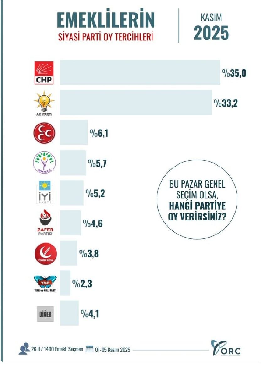 ORC'nin ilk araştırma sonucu Emeklilerin siyasi parti tercihlerini ölçen bir kamuoyu araştırması. ORC'nin 26 ilde 1400 emekli seçmene yönelttiği “Bu pazar genel seçim olsa hangi partiye oy verirsiniz” sorusuna verilen yanıtlara göre emeklilerin oy tercihi CHP oldu. ORC Araştırma tarafından yapılan araştırmanın sonucuna göre, emeklilerin yüzde 35’i Cumhuriyet Halk Partisi’ni, yüzde 33,2’si ise AK Parti’yi tercih edeceğini bildirdi. Katılımcıların yüzde 6,1’i Milliyetçi Hareket Partisi’ne, yüzde 5,7’si Dem Parti’ye, yüzde 5,2’si İyi Parti’ye, yüzde 4,6’sı Zafer Partisi’ne, yüzde 3,8’i ise Yeniden Refah Partisi’ne oy vereceğini belirtti. Yerli ve Milli Parti’nin oy oranı yüzde 2,3 olarak ölçülürken, diğer partilerin toplamı yüzde 4,1 seviyesinde kaydedildi.
