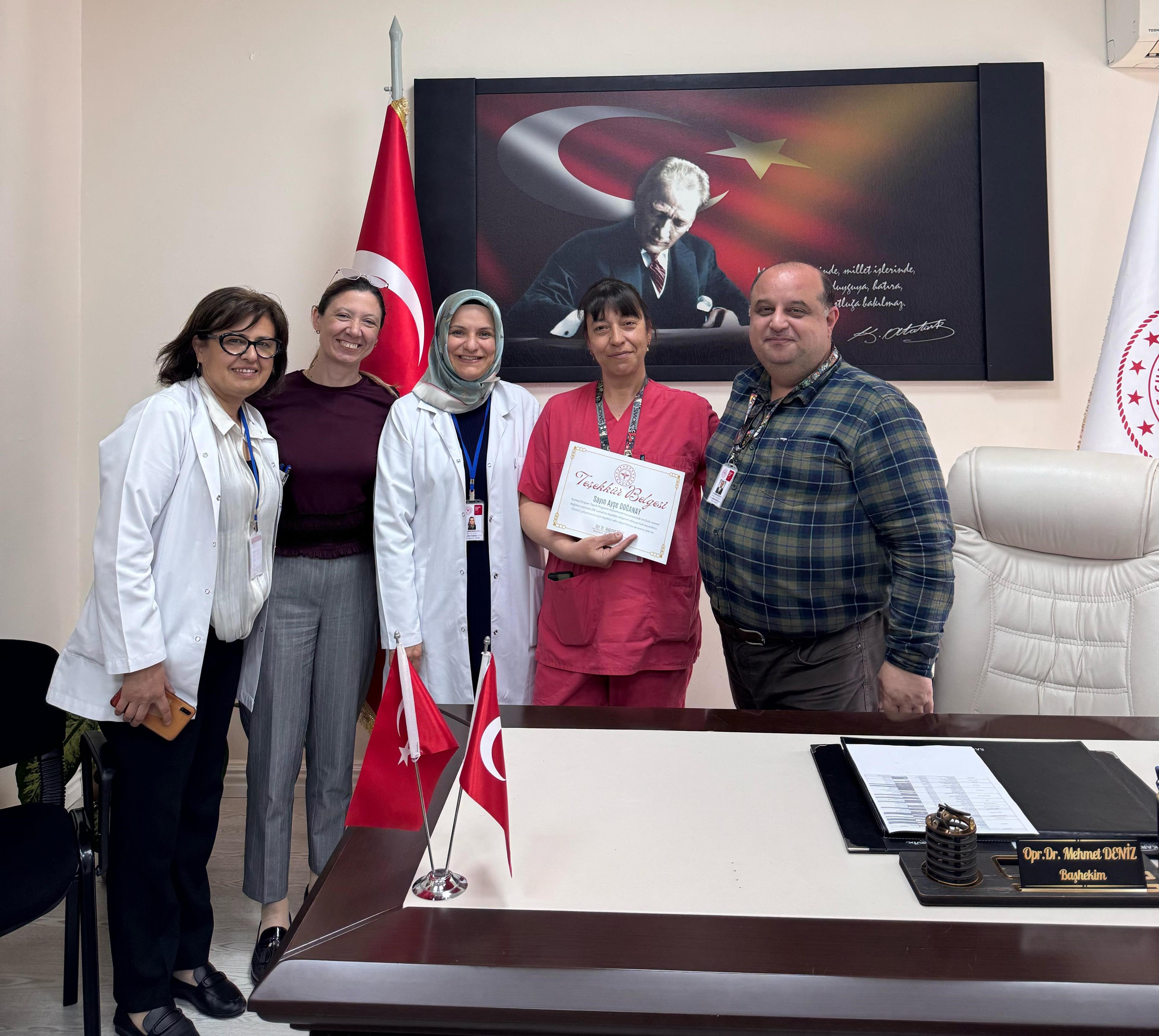 Normal doğumun anne, bebek ve toplum sağlığı açısından büyük önem taşıdığına dikkat çeken Manavgat Devlet Hastanesi Başhekim Yardımcısı Uzman Dr. Mehmet Ali Karlıdağ, "Sezaryen bir gereklilik değil, ancak tıbbi zorunluluk halinde başvurulması gereken bir yöntemdir. Eylem planımız kapsamında 2024 ve 2025 yılının ilk 3 ayında en fazla normal doğum yaptıran ebeye teşekkür belgesi takdim ediyoruz. 2025 yılı boyunca her ay en az sezaryen yapan hekim, ebe ve hemşirelere teşekkür belgesi verilecektir. Ebe Ayşe Doğanay’a özverili çalışmaları ve normal doğuma katkılarından dolayı teşekkür ediyorum" dedi.