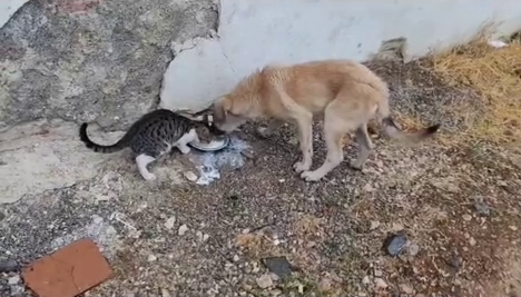 Denizli Haber - Denizli’nin Acıpayam İlçesi Yassıhöyük Mahallesi’nde vatandaşların cep telefon kameralarına yakalanan bir görüntü, insanları hem gülümsetti hem de düşündürdü. Bir vatandaş tarafından cep telefonu kamerasına kaydedilen görüntülerde kedi ve köpeğin hiçbir kavga etmeden, aynı kaptan mamalarını paylaştıkları görüldü. İki ezeli düşman olan kedi ve köpeğin bu samimi tablosu ise “insanlara örnek olsun” yorumlarını da beraberinde getirdi.