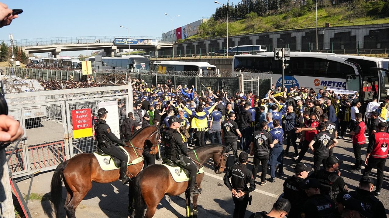 Spor Haber- Trendyol Süper Lig’in 31. haftasında Galatasaray ile Fenerbahçe saat 20.00’de RAMS Park’ta karşı karşıya gelecek. Bu zorlu müsabakayı İl Spor Güvenlik Kurulu kararı gereği 2 bin 488 sarı-lacivertli taraftar da stattan takip edecek. Bugün saat 15.00’te Fenerbahçe Şükrü Saracoğlu Spor Kompleksi önünde toplanan taraftarlar bilet kontrolünün ardından otobüslere bindi. Fenerbahçe yönetimi de deplasmanda takımlarını takip edecek taraftarlara jest yaparak çubuklu forma hediye etti. Taraftarlar daha sonra maçın oynanacağı stadyuma hareket etti. Fenerbahçe taraftarını taşıyan 45 otobüs stada ulaştı. Yoğun güvenlik önlemleri altında geçiş yapan sarı-lacivertli taraftarlar beste ve tezahüratlarla tribünlere giriş yaptı.